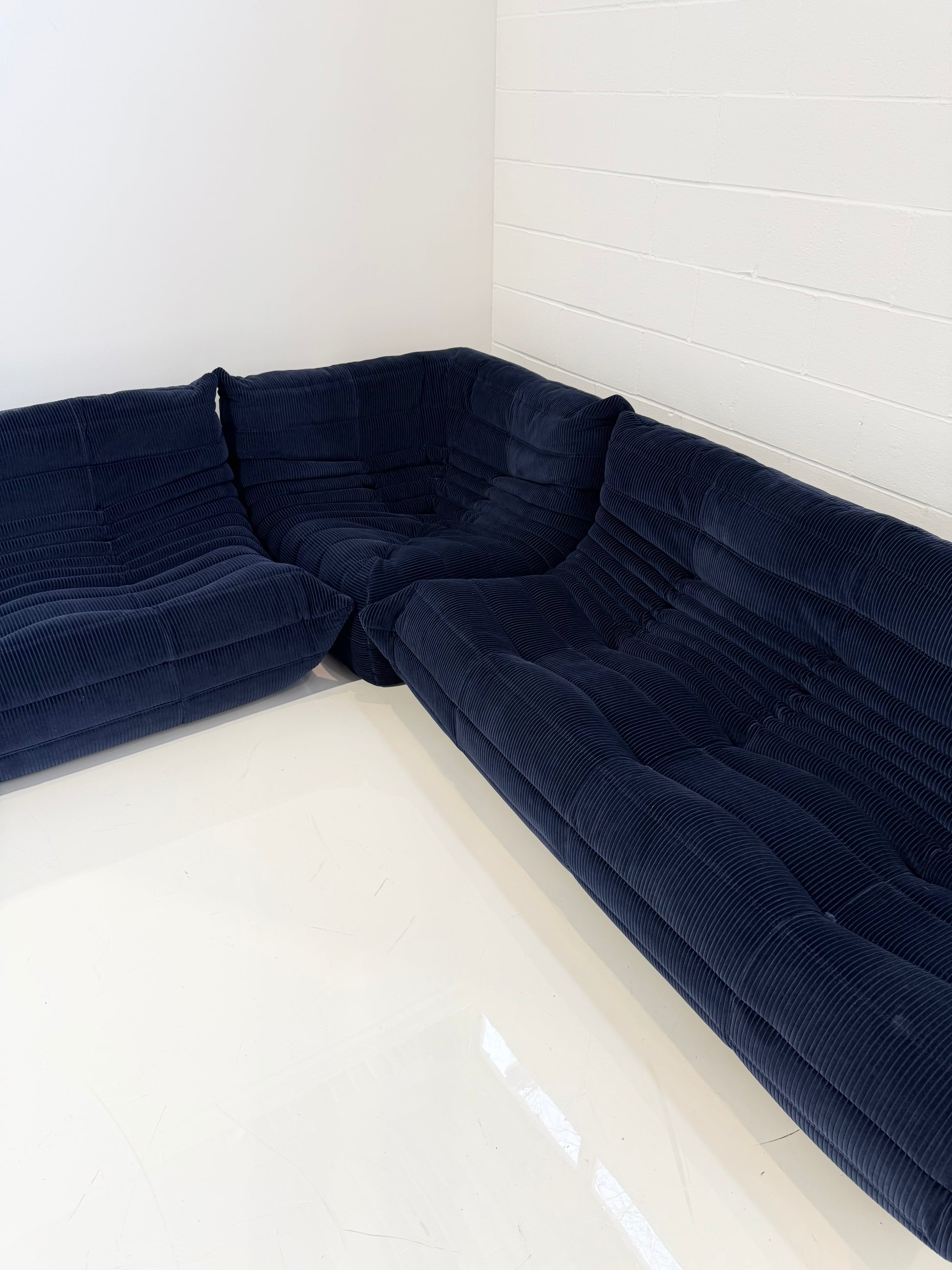 This Togo® Sectional, as seen in our Forsyth showroom, is a 3-Piece Composition consisting of a Corner Seat, 2-Seater Sofa, and 3-Seater Sofa. The fabric we chose is the ever popular Phlox by Raf Simons for Kvadrat in a Navy colorway. Phlox is Simons’ interpretation of the classic corduroy fabric and is also available in other colors, click here to view.