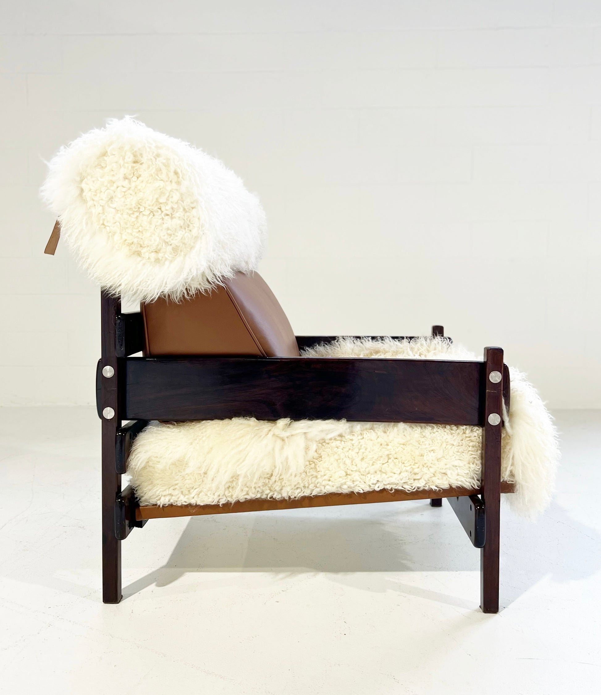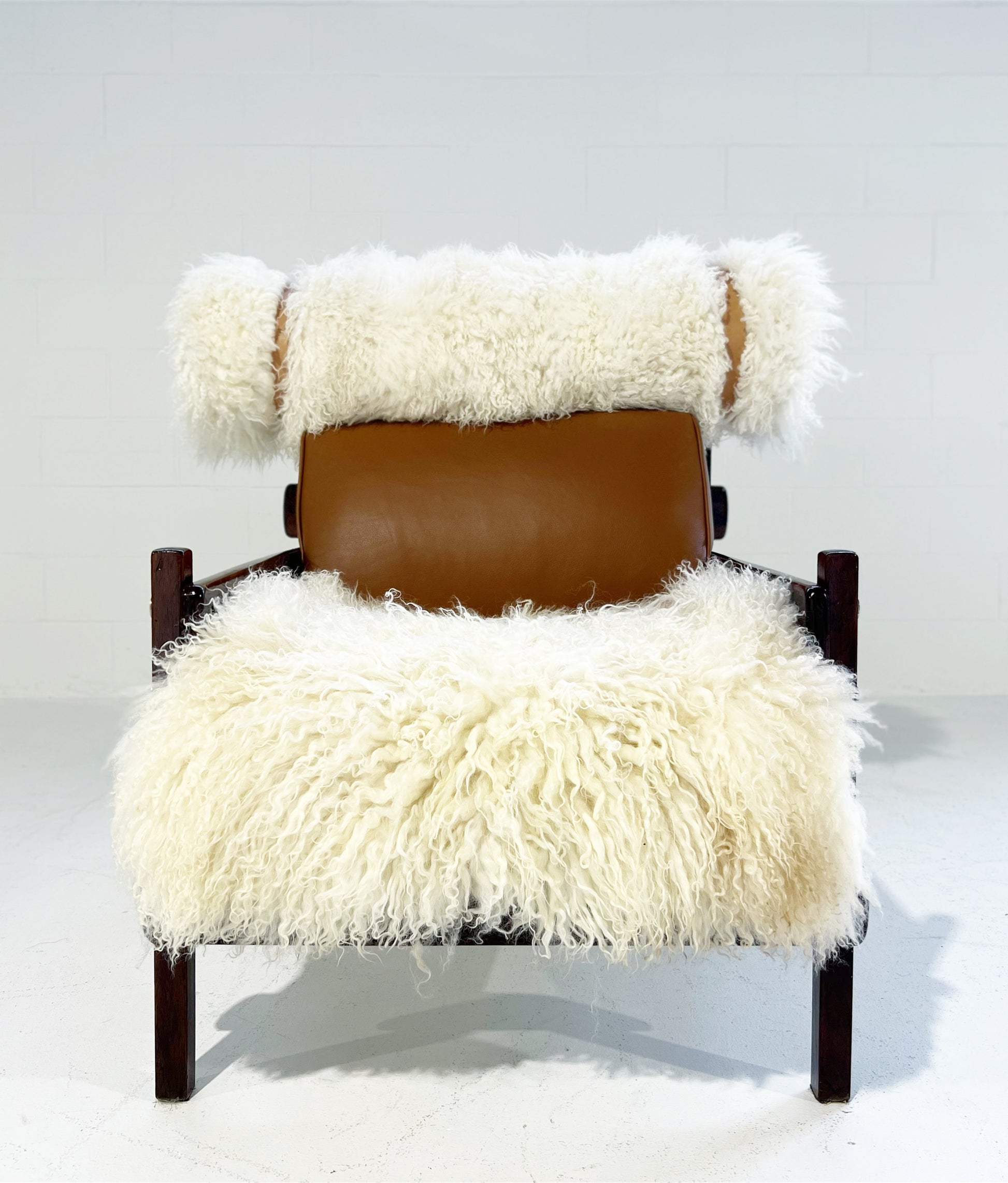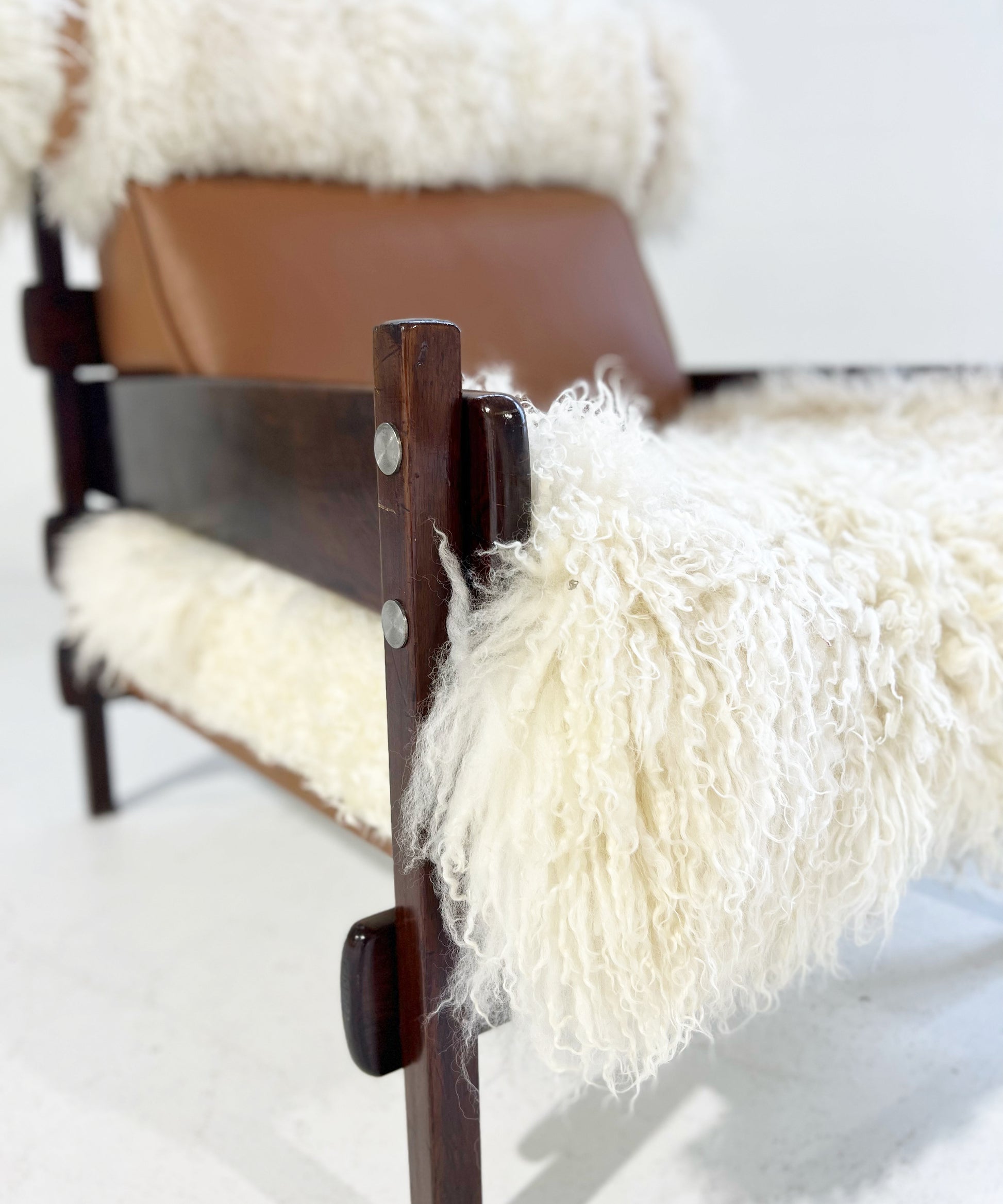 This Tonico lounge chair was designed by Rodrigues in circa 1960. It is made from solid Jacaranda and masterfully restored in Gotland sheepskin and Loro Piana buffalo leather. Our designers chose to cover the top bolster pillow and seat in our curly, silky soft Gotland sheepskin. The lumbar cushion and bottom of the seat is in the Loro Piana leather. The look creates a beautiful contrast in texture and color between the two materials as well as the beautiful wood.