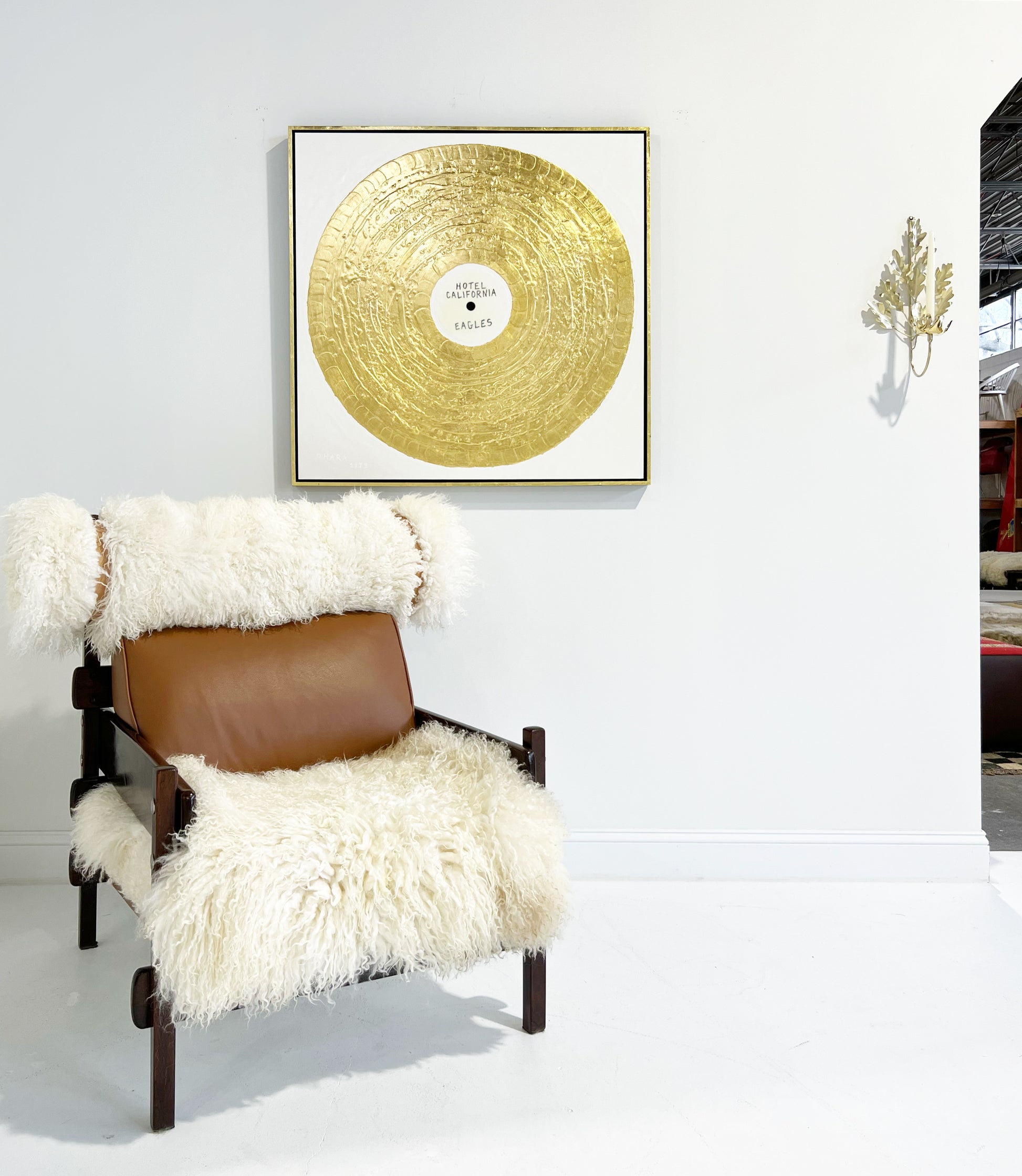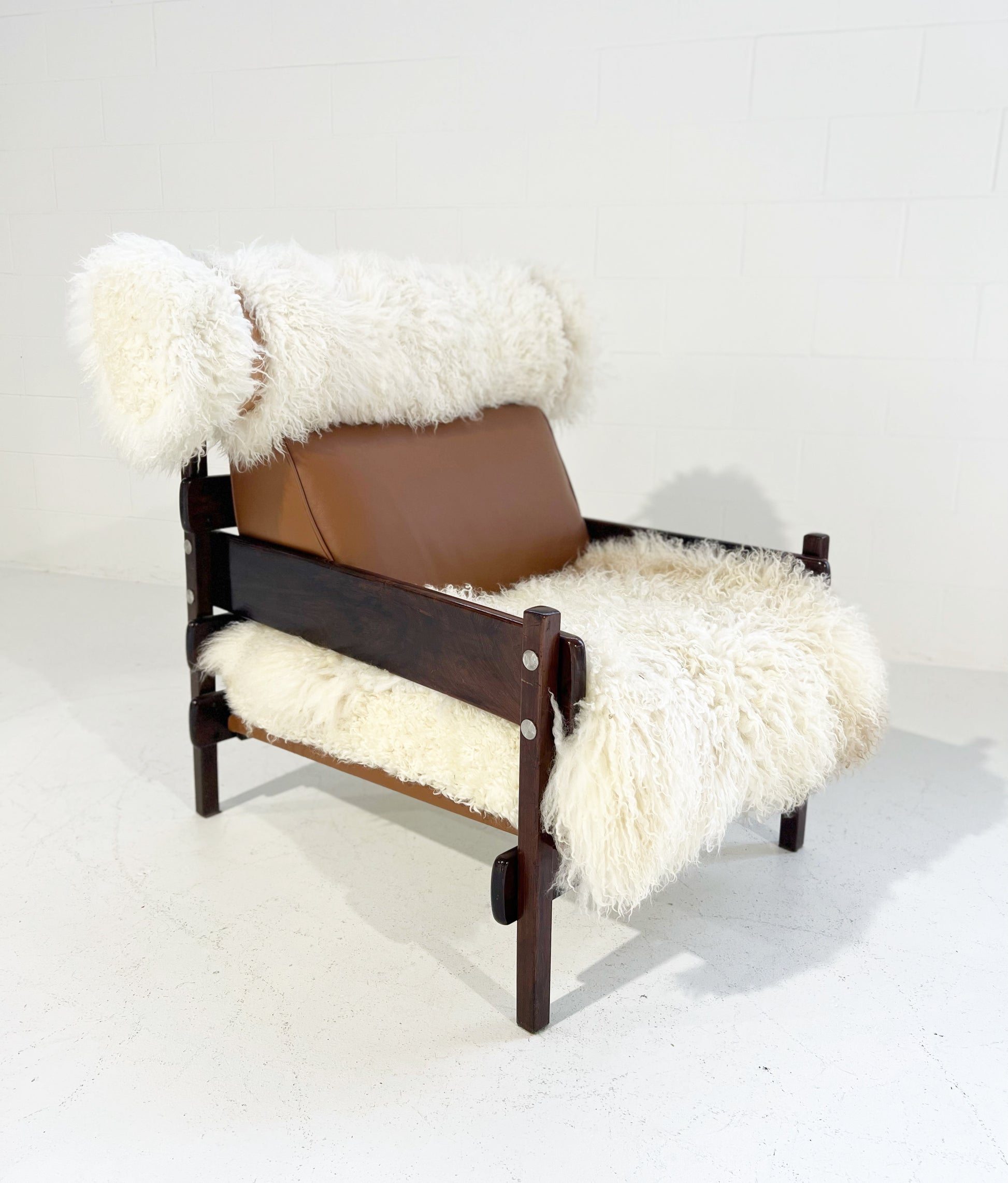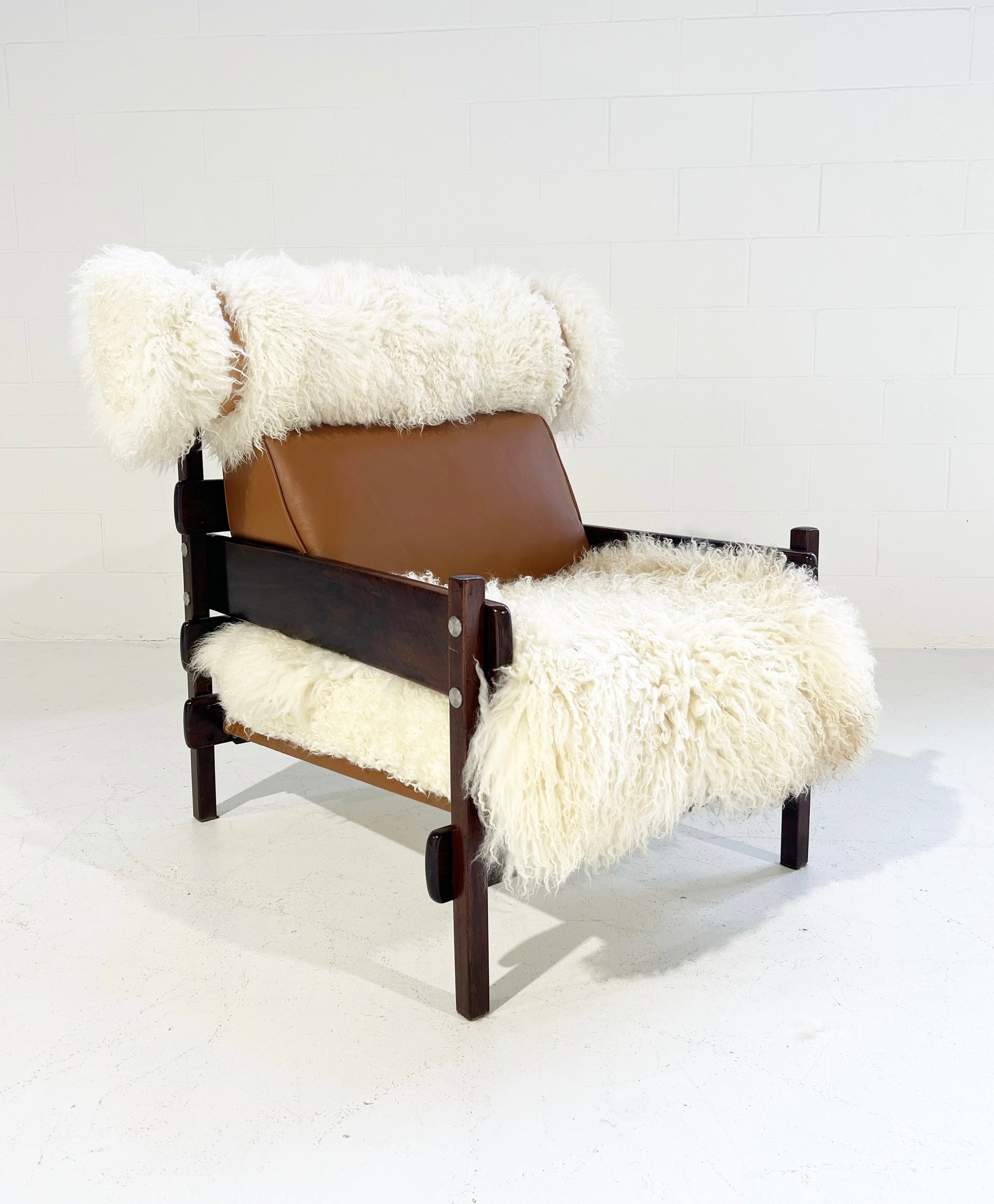 This Tonico lounge chair was designed by Rodrigues in circa 1960. It is made from solid Jacaranda and masterfully restored in Gotland sheepskin and Loro Piana buffalo leather. Our designers chose to cover the top bolster pillow and seat in our curly, silky soft Gotland sheepskin. The lumbar cushion and bottom of the seat is in the Loro Piana leather. The look creates a beautiful contrast in texture and color between the two materials as well as the beautiful wood.