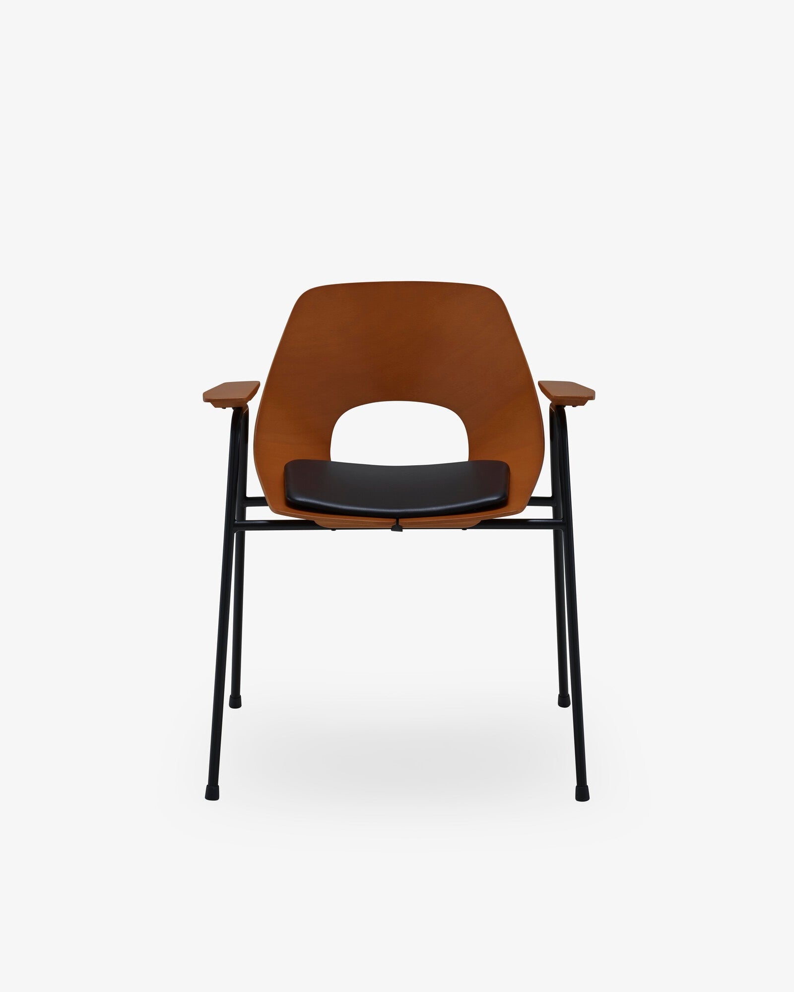 Shell in molded plywood and stained beech veneer. Black lacquered steel base. For the carver chair, the armrests are in solid stained beech. Black leather seat pad, Goat leather, semi-aniline full-grain goatskin (pigmented), CM 50 kg / m3 polyurethane foam interior (to be fixed under the seat using 2 velcro ties). Wraparound pads. HEIGHT OF ARMS IS 25 1/4''. The TONNEAU chair has successfully passed the relevant FCBA tests confirming its suitability for contract use.