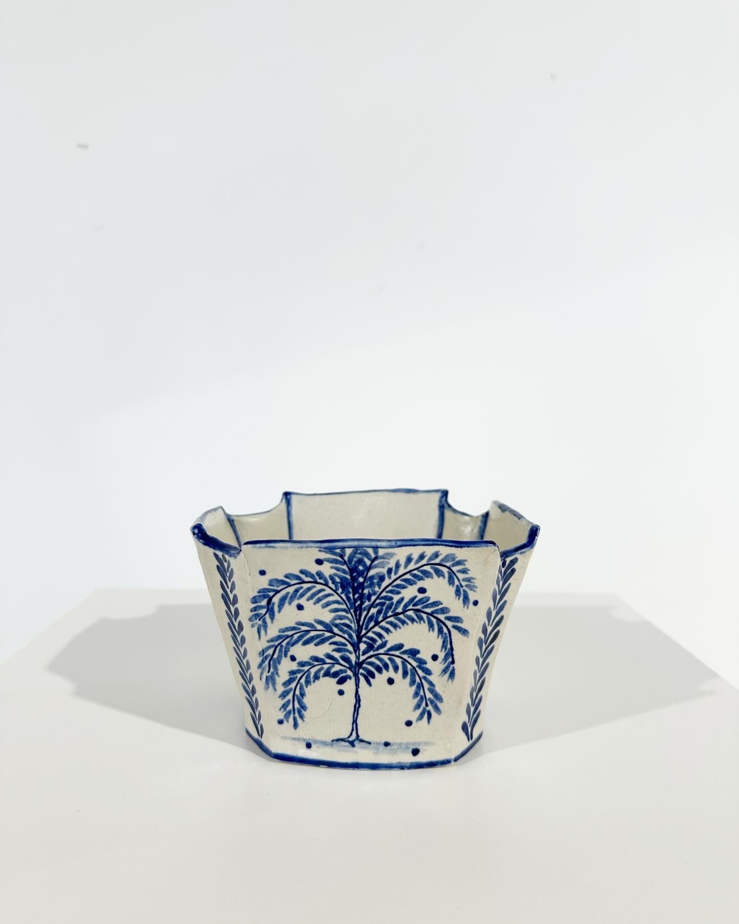 The Country Gentleman Collection by artist Maggie Robertson is a beautiful series of one-of-a-kind stoneware vessels. Each unique piece embraces the seams and irregularities of her hand-built technique complemented by intricate, hand-painted scenes of the English countryside in classic blue and white. The vessels are water tight and food safe, microwaveable and dishwasher safe; however, as they are art pieces and fragile, we would recommend hand washing.