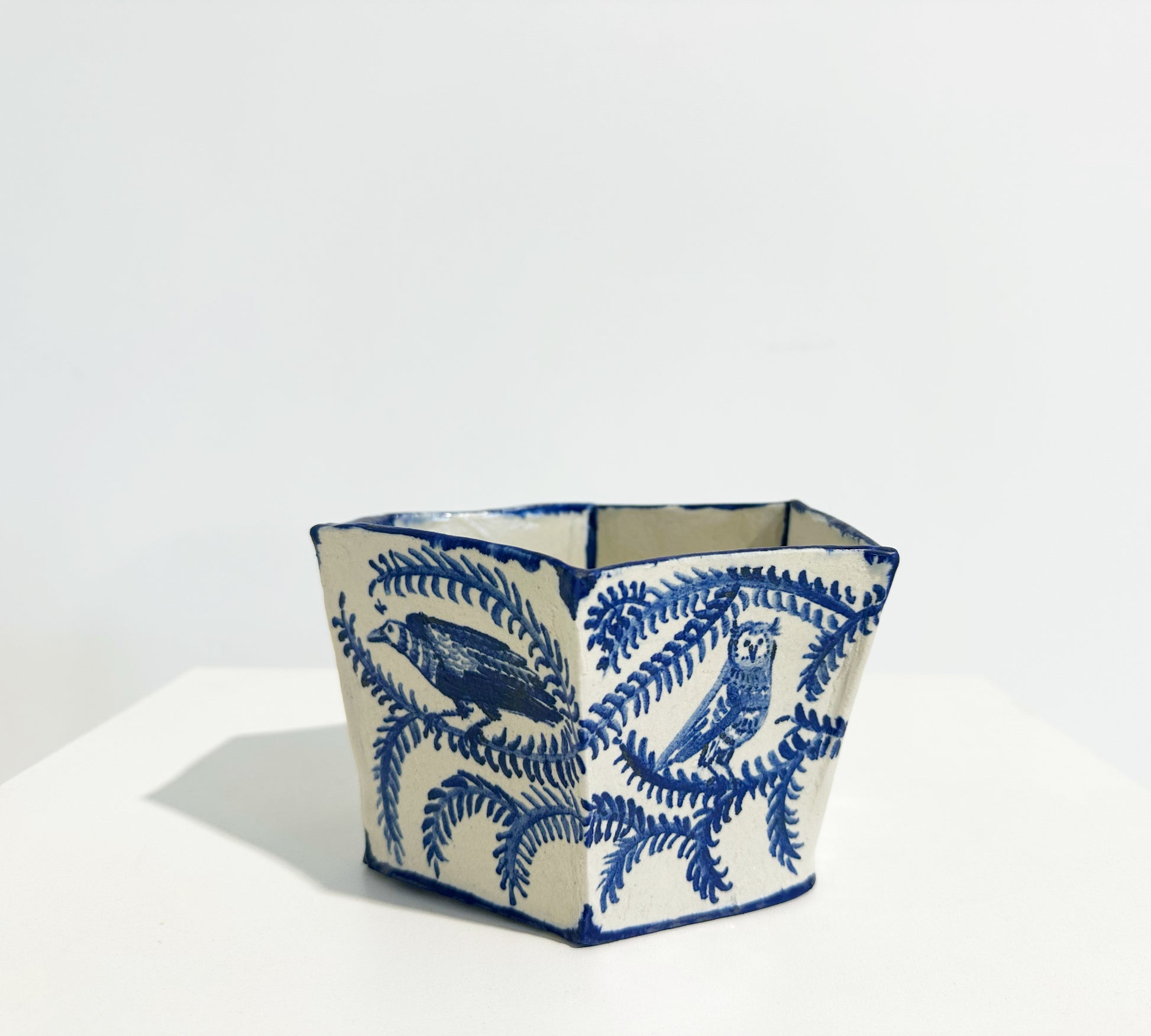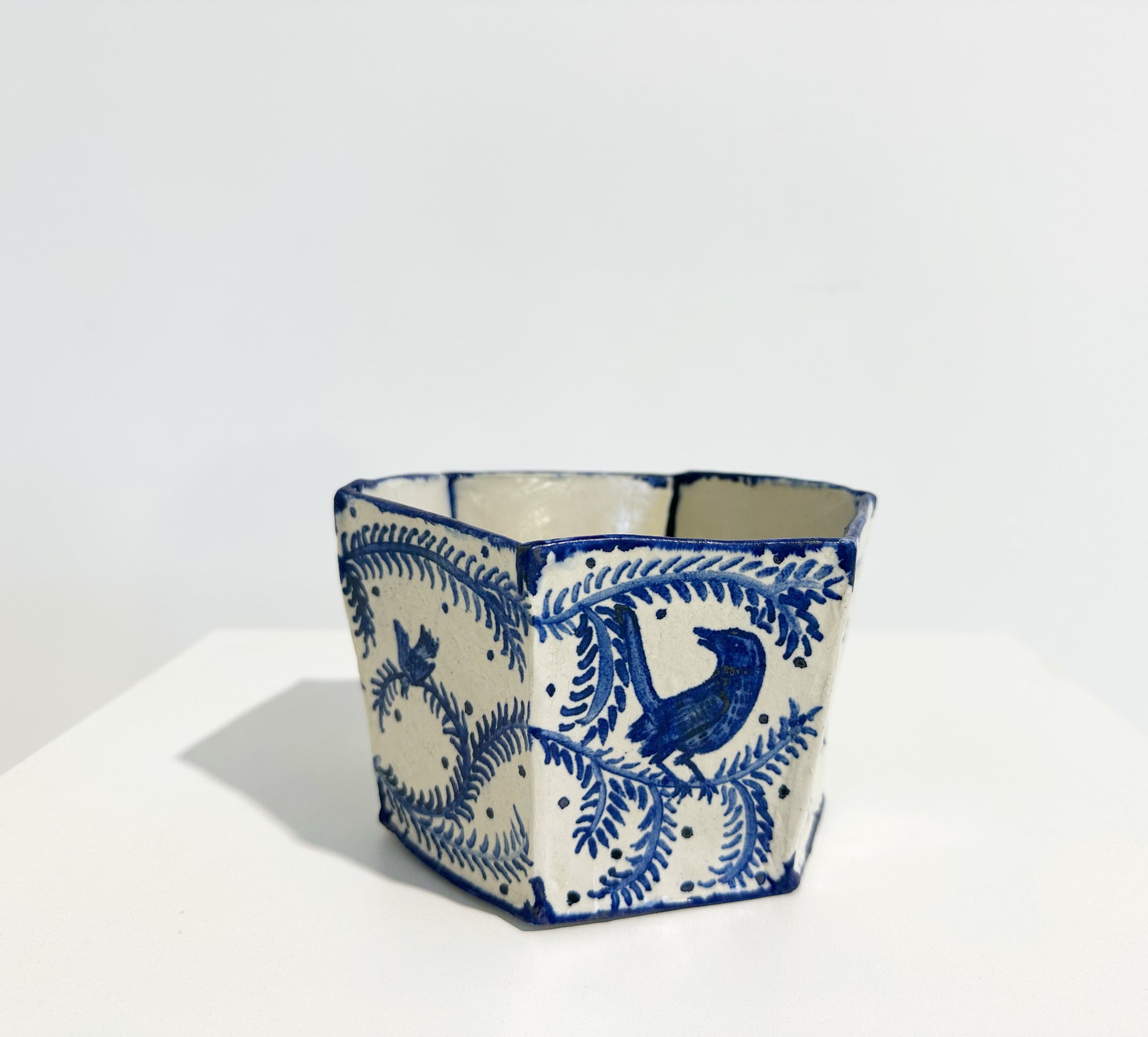 The Country Gentleman Collection by artist Maggie Robertson is a beautiful series of one-of-a-kind stoneware vessels. Each unique piece embraces the seams and irregularities of her hand-built technique complemented by intricate, hand-painted scenes of the English countryside in classic blue and white. The vessels are water tight and food safe, microwaveable and dishwasher safe; however, as they are art pieces and fragile, we would recommend hand washing.