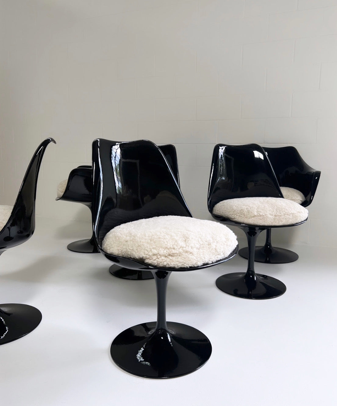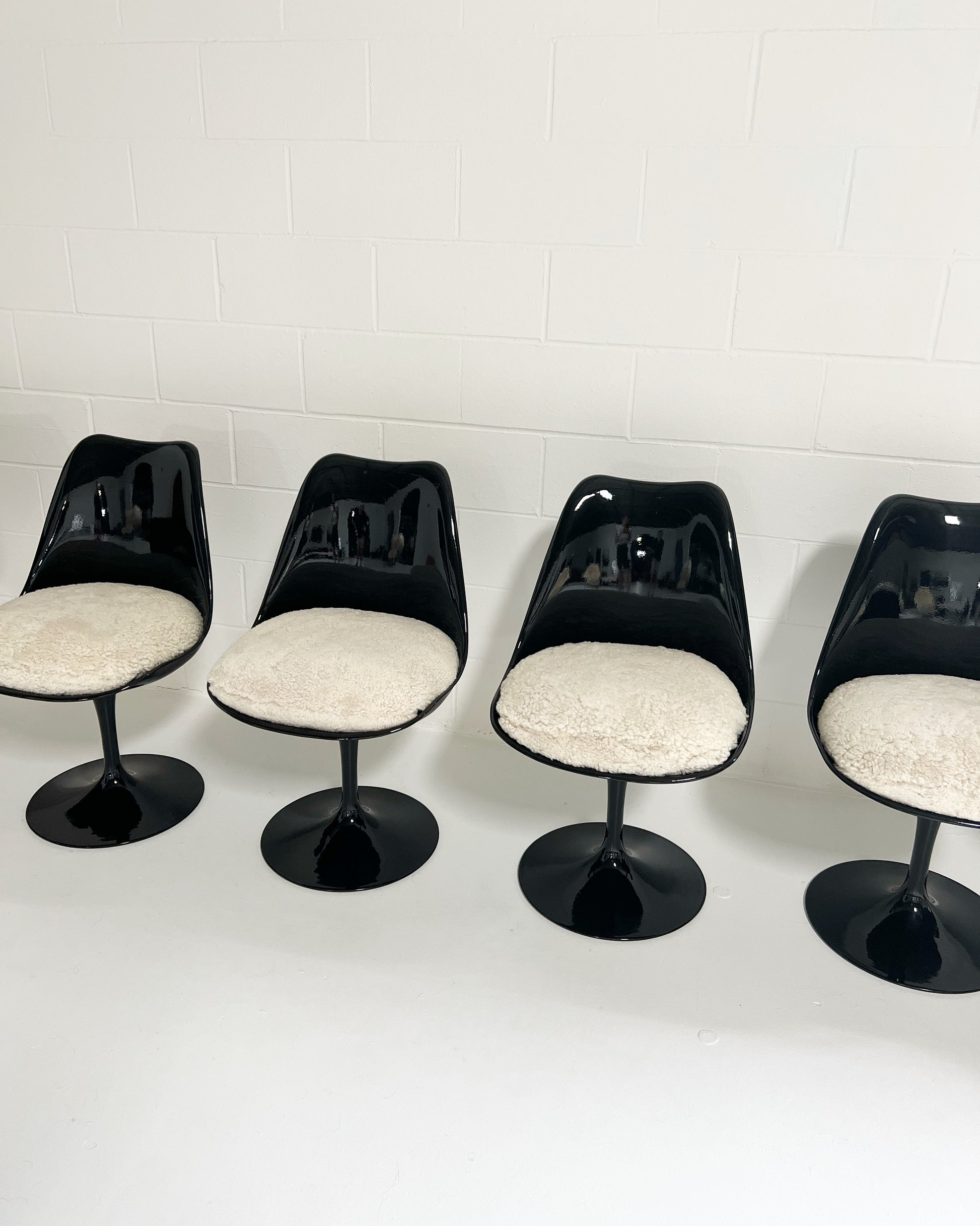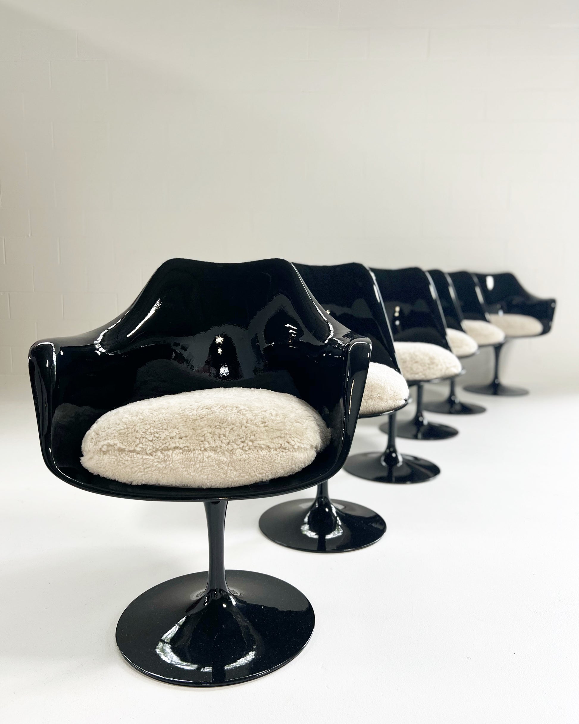 It took Saarinen five years to arrive at this exact design. The iconic Tulip chairs were envisioned to create peaceful interiors in which the legs of the furnishings did not obstruct viewing lines. We collected this vintage set of 6 Tulip Chairs and decided the yellowing, aged fiberglass needed a big update, so each chair received a coat of fresh, glossy black paint. They are in excellent condition. We custom-made the luxurious feather-filled cushions for each chair from beautiful and cozy sheepskins in a moonlight color. These are so cool and so extremely comfortable. Set consists of 4 chairs and 2 armchairs. Also, the original Knoll labels were re-attached to the chairs.