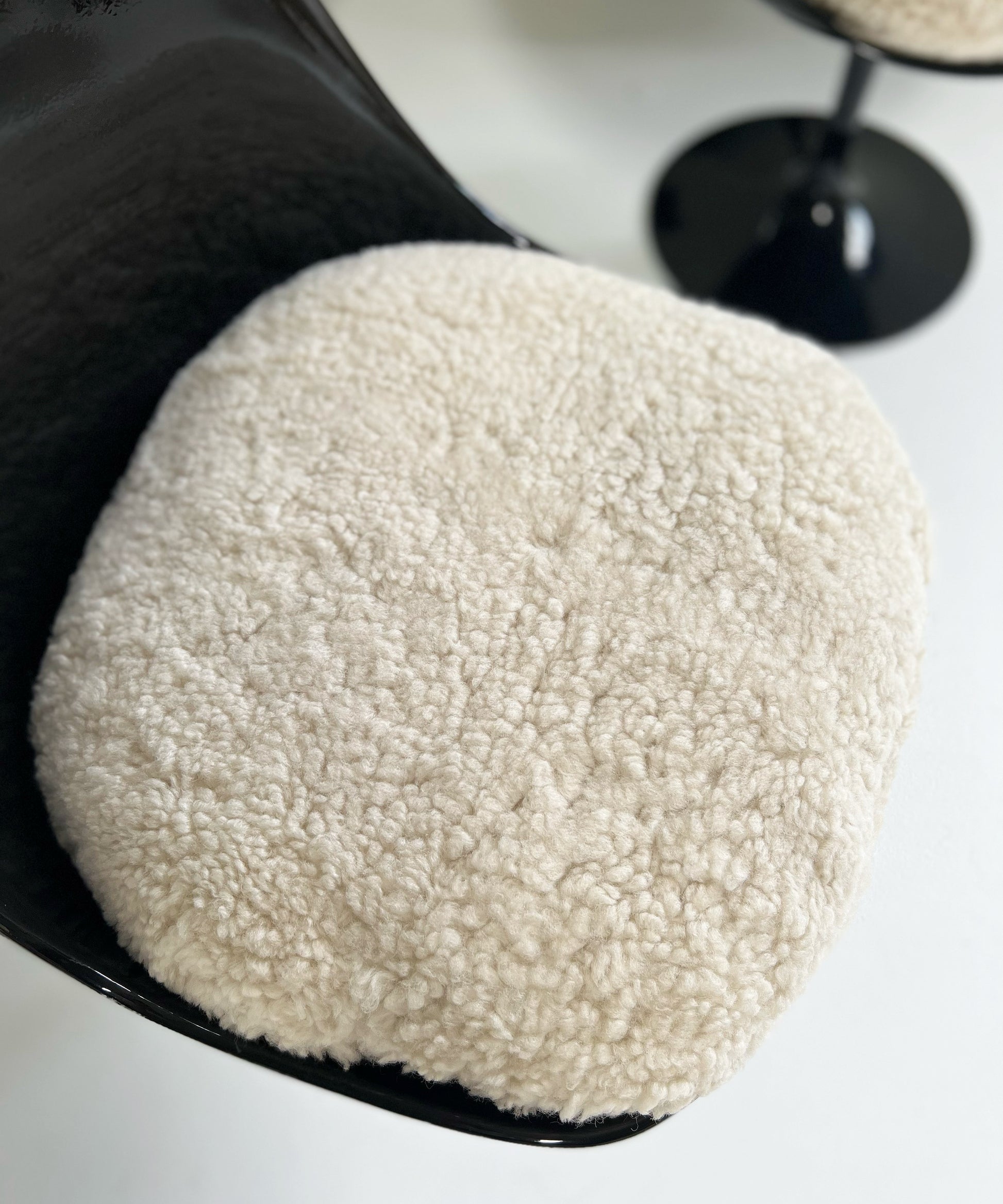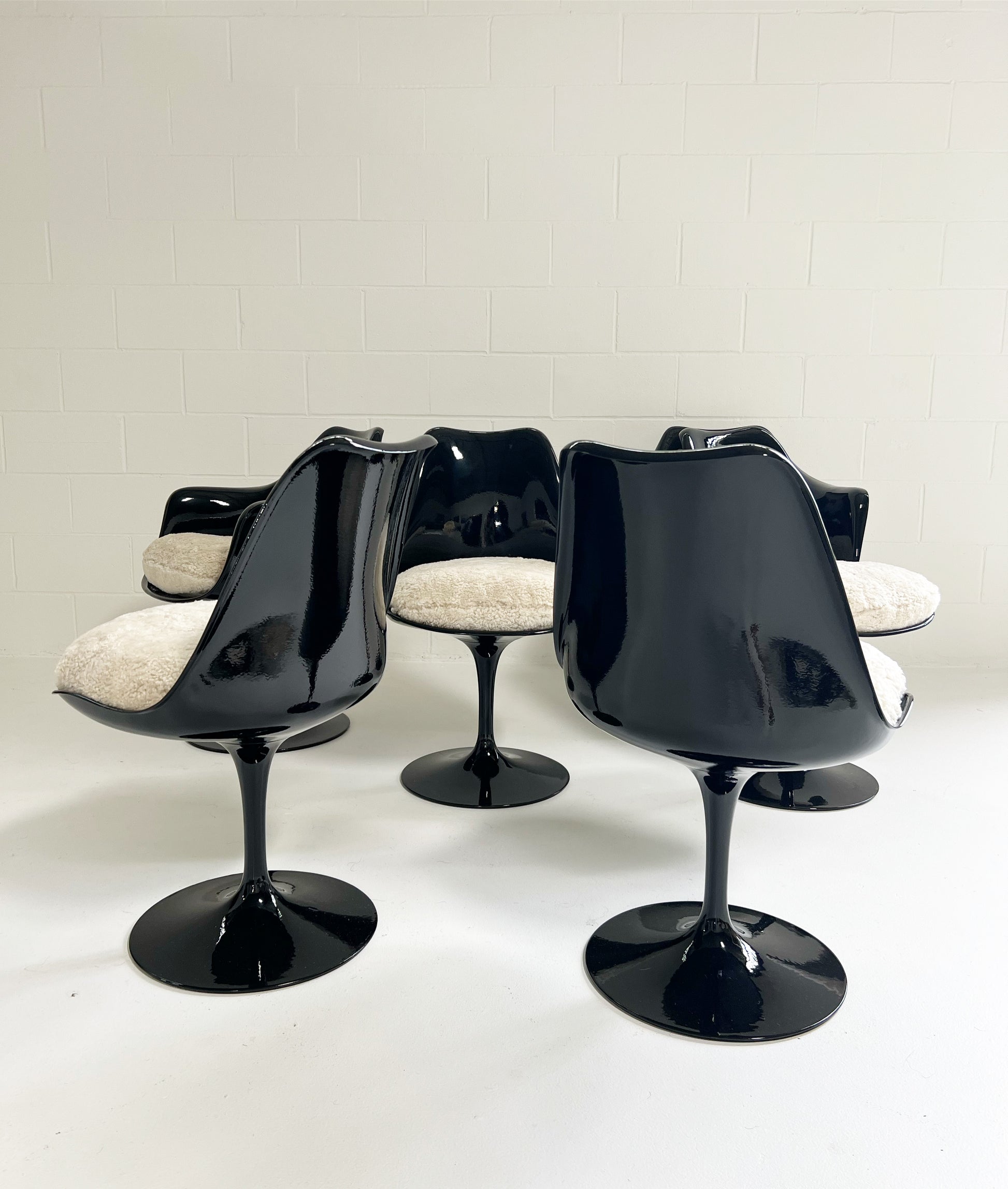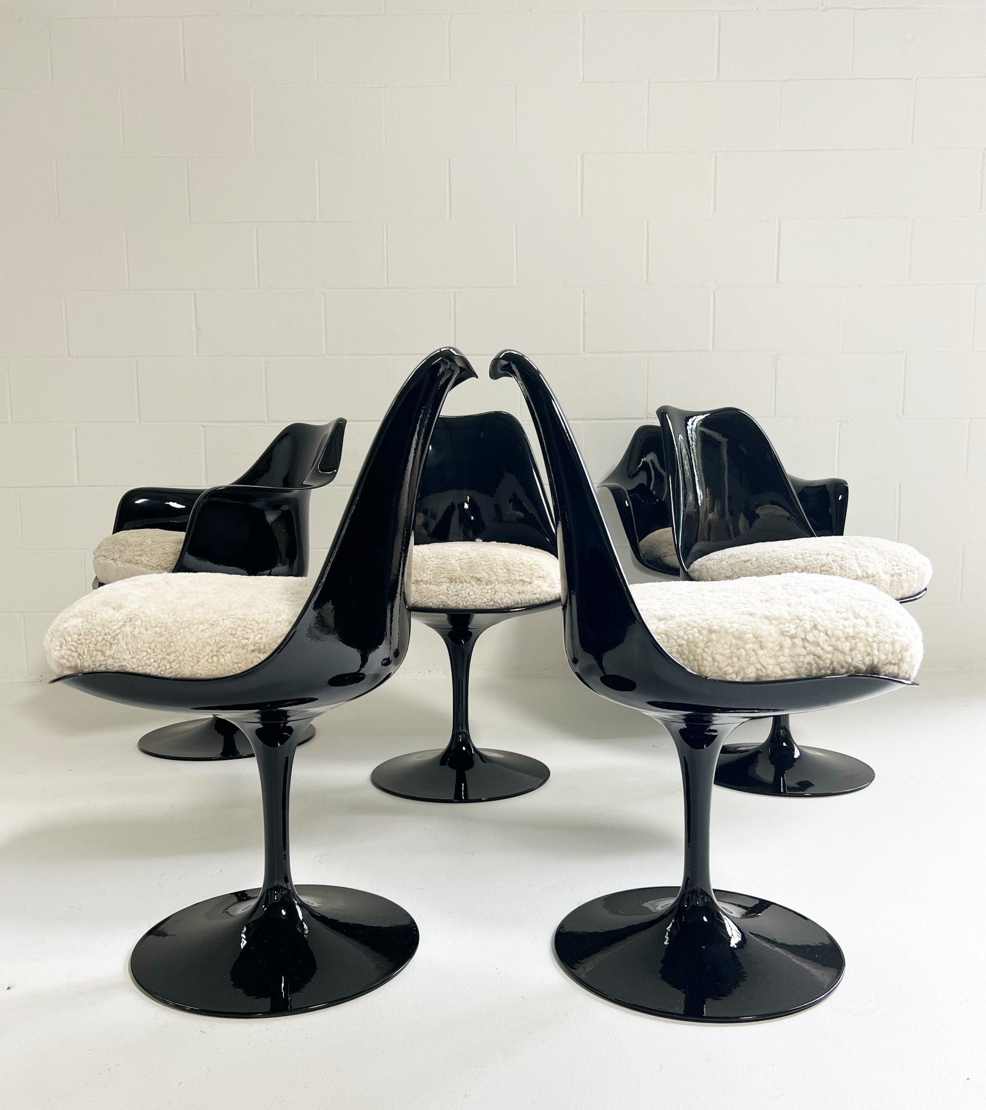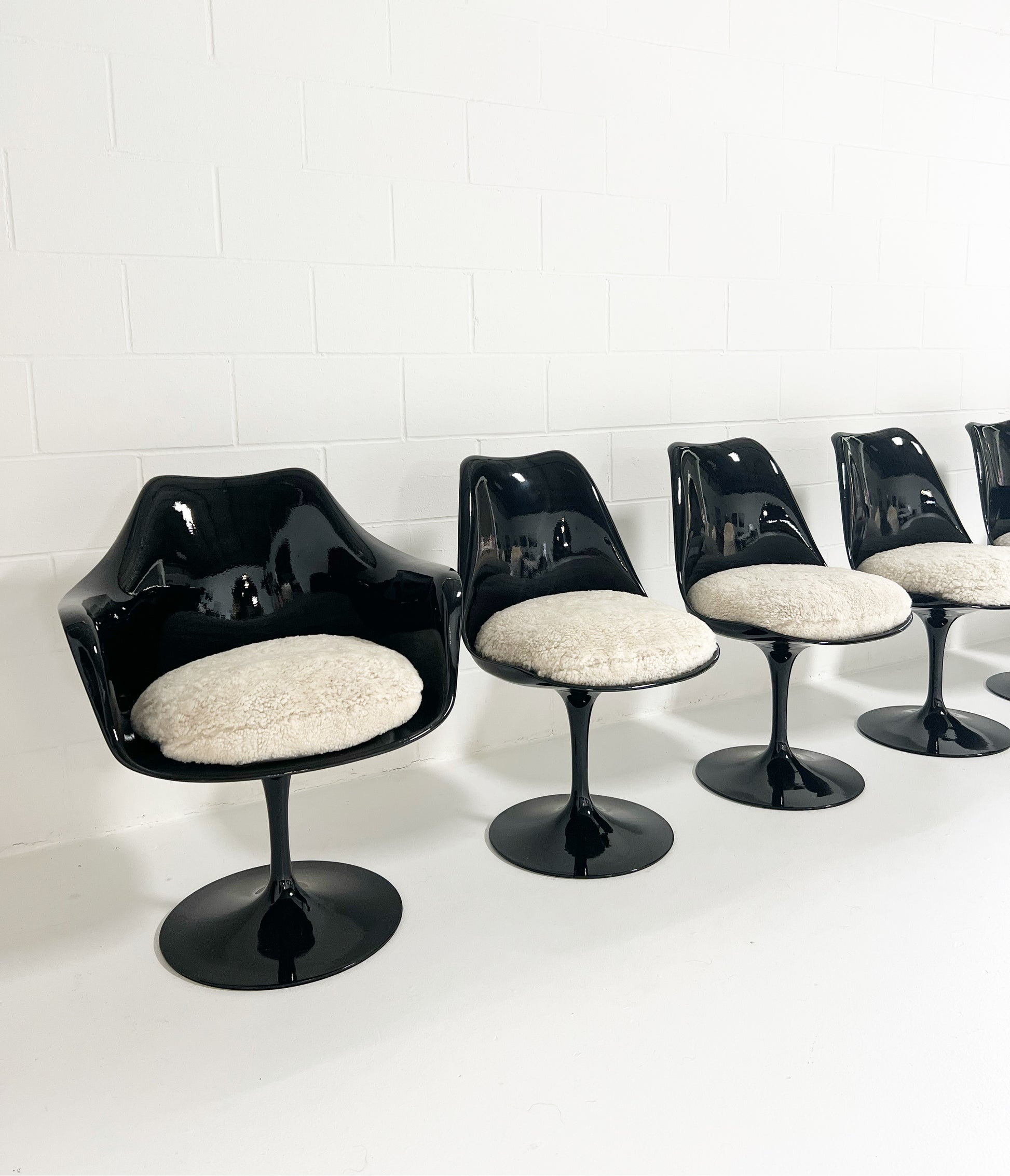 It took Saarinen five years to arrive at this exact design. The iconic Tulip chairs were envisioned to create peaceful interiors in which the legs of the furnishings did not obstruct viewing lines. We collected this vintage set of 6 Tulip Chairs and decided the yellowing, aged fiberglass needed a big update, so each chair received a coat of fresh, glossy black paint. They are in excellent condition. We custom-made the luxurious feather-filled cushions for each chair from beautiful and cozy sheepskins in a moonlight color. These are so cool and so extremely comfortable. Set consists of 4 chairs and 2 armchairs. Also, the original Knoll labels were re-attached to the chairs.