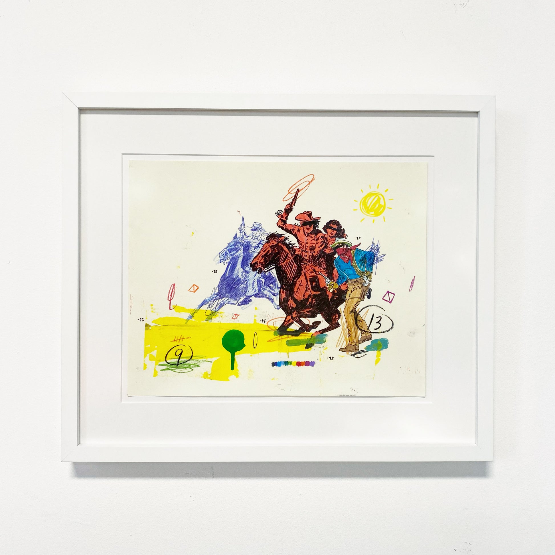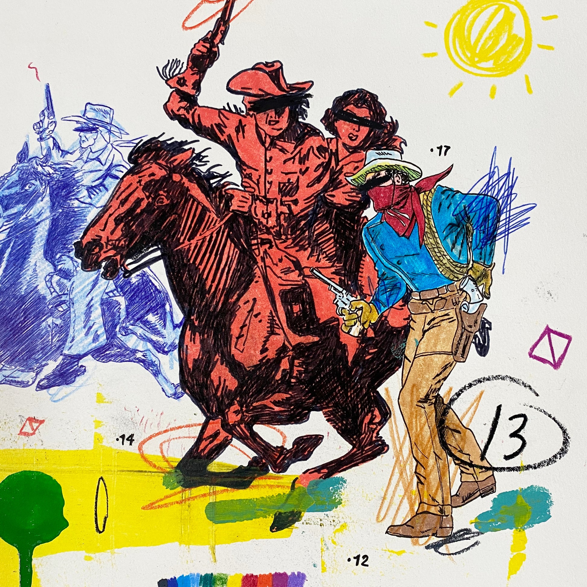 American (b. 1975). Matt Eddmenson, who graduated from The Art Academy of Cincinnati in 1999, draws from a range of influences and sources for his practice, including Cowboy Comics, Pop Art, and the work of Cy Twombly. His works are gatherings and reconfigurations of American imagery and iconography, commonly featuring cowboys, skulls, and rodeo horses. He also incorporates images from the golden age of comics and tattoo culture. Eddmenson explains: “I work from my memories as a child, I learned to draw by tracing comic book covers over and over until I was able to draw these characters from memory—I have a deep admiration for comic book art.” Works like 'You Keep Twistin My Words Around' (2020) and 'Don't Look at the Sun Too Long' (2020) demonstrate Eddmenson’s ability to reference western comics, his love for postmodern masters, and the great colorists of the 21st century.