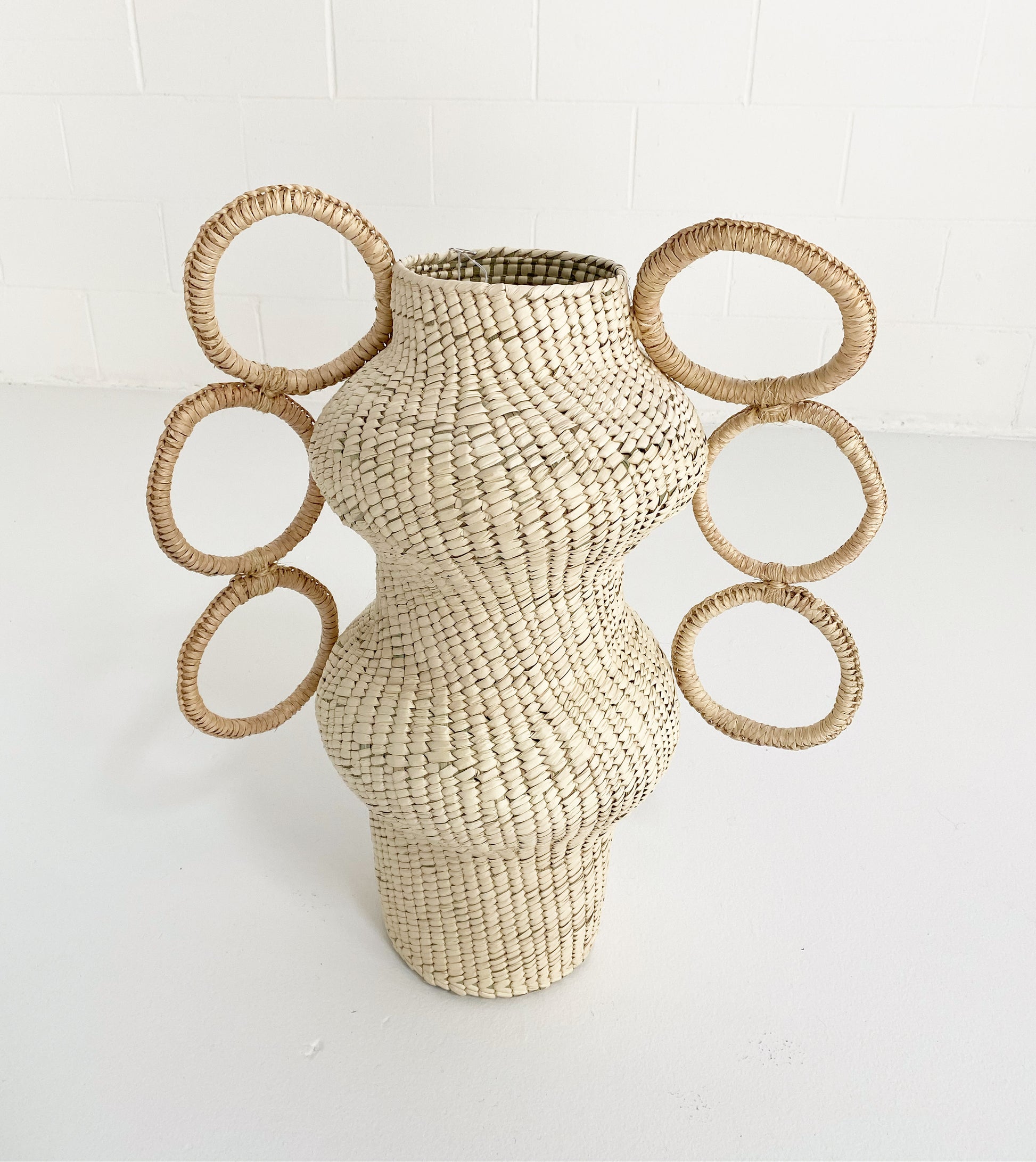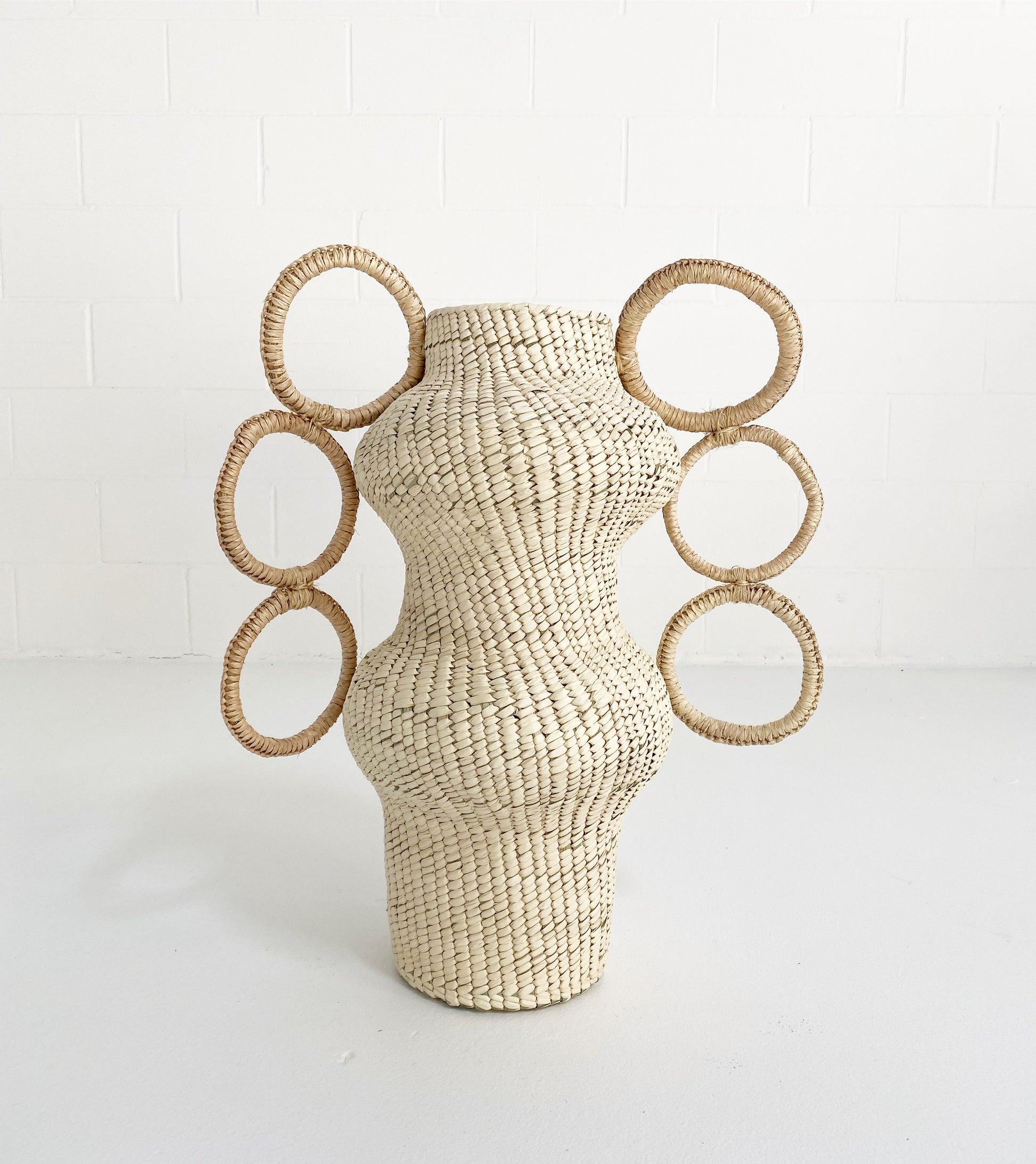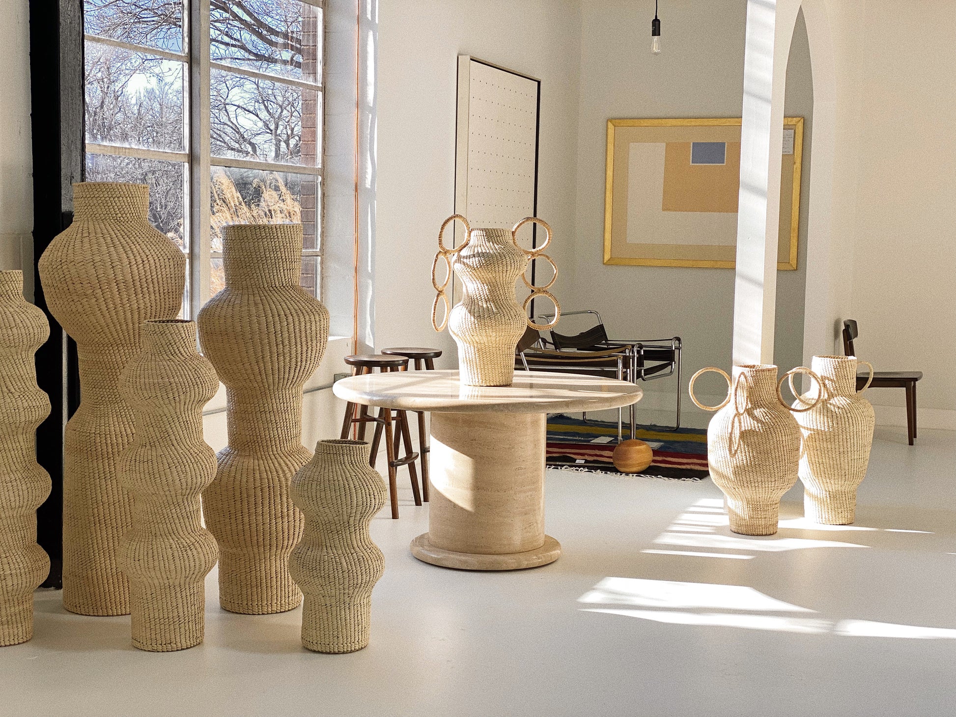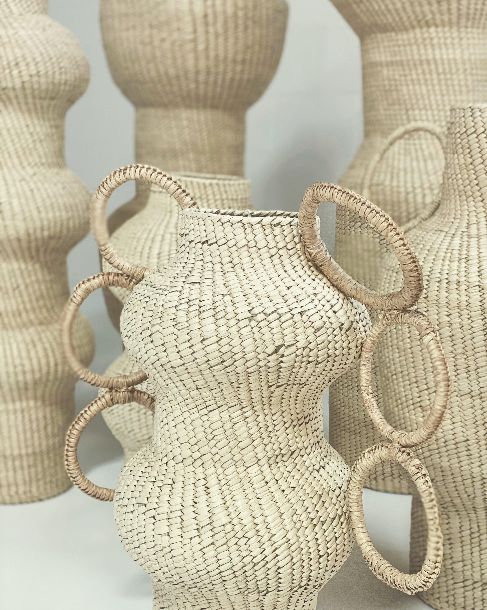 The Family series of palm sculptures is inspired by the artisan families who work with Rrres studio. The sculptures are created using traditional techniques. Each is reinforced for greater durability and to achieve the large volume. The beautiful palm material changes color as it ages. In its youngest state, it is a warm yellow, as they get older, the color changes to a salmon tone.