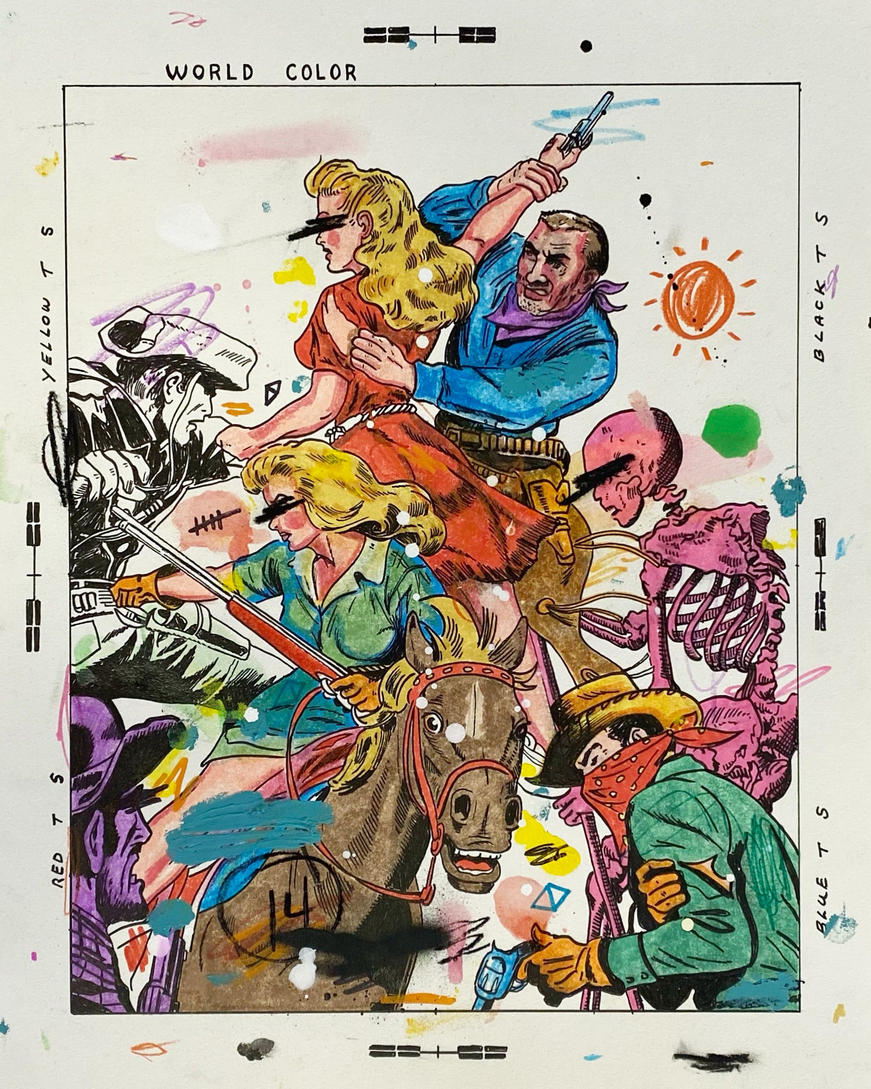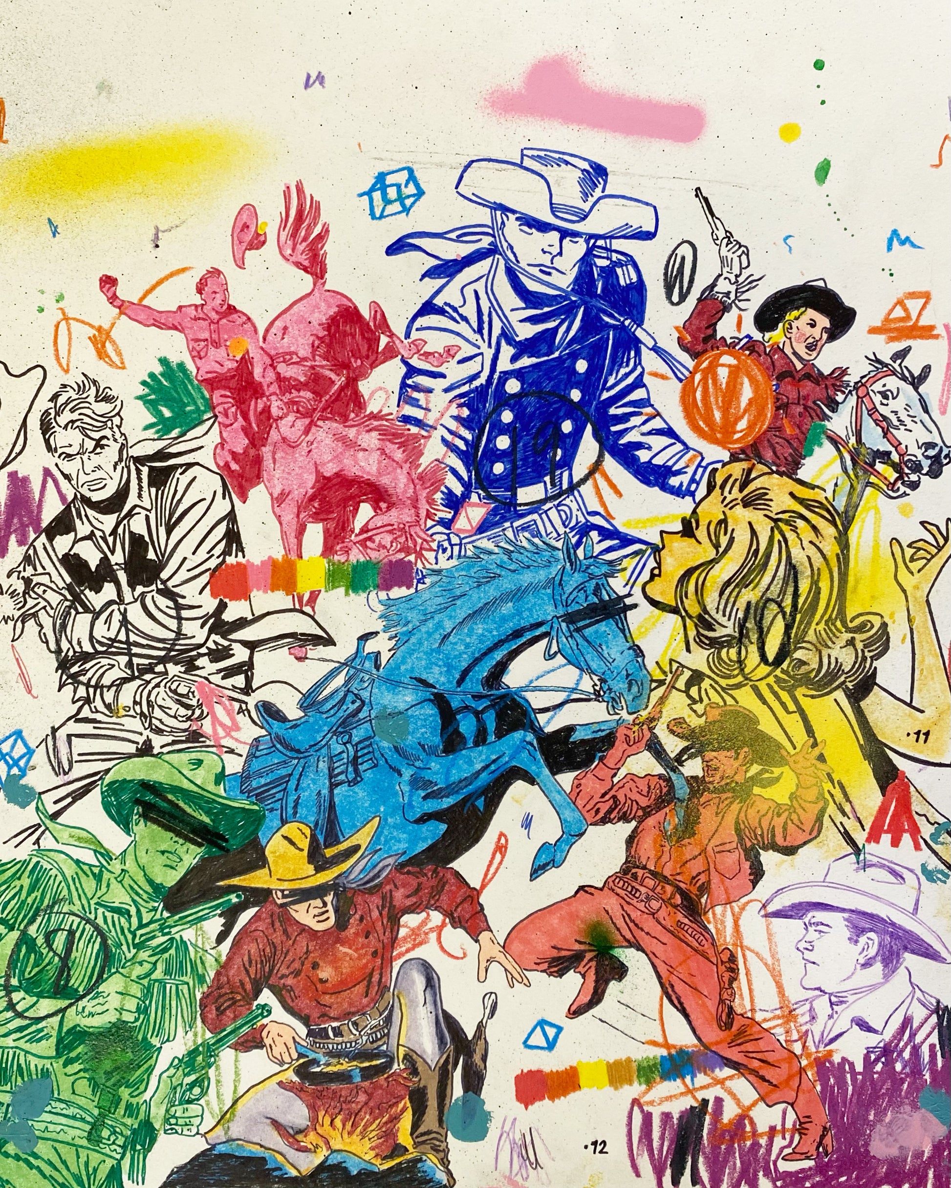 American (b. 1975). Matt Eddmenson, who graduated from The Art Academy of Cincinnati in 1999, draws from a range of influences and sources for his practice, including Cowboy Comics, Pop Art, and the work of Cy Twombly. His works are gatherings and reconfigurations of American imagery and iconography, commonly featuring cowboys, skulls, and rodeo horses. He also incorporates images from the golden age of comics and tattoo culture. Eddmenson explains: “I work from my memories as a child, I learned to draw by tracing comic book covers over and over until I was able to draw these characters from memory—I have a deep admiration for comic book art.” Works like 'You Keep Twistin My Words Around' (2020) and 'Don't Look at the Sun Too Long' (2020) demonstrate Eddmenson’s ability to reference western comics, his love for postmodern masters, and the great colorists of the 21st century.