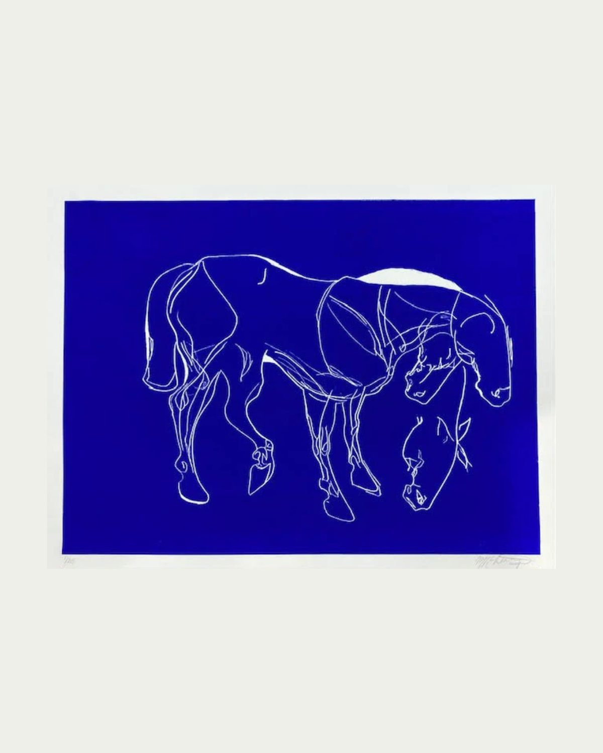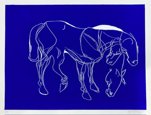 Artist Maggie Robertson translates her Big Blue Horse paintings into printmaking with this new series of limited edition relief prints. The impact of the ultramarine blue and her refined approach to depict all that the horse imbues leaves one with a sense of energy and joy. Her practiced use of contrasting lines expresses the action and beauty of the horse most effectively.