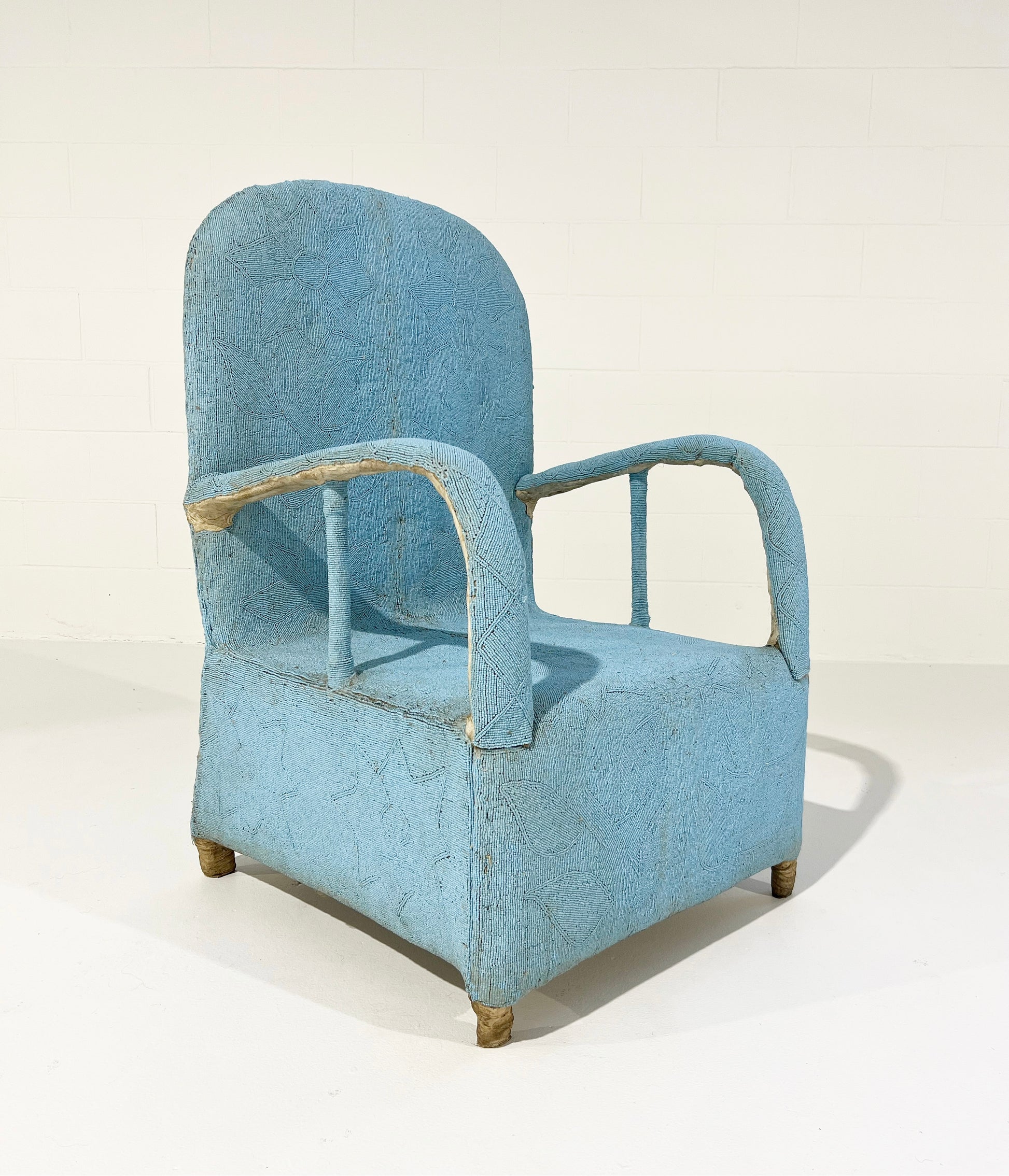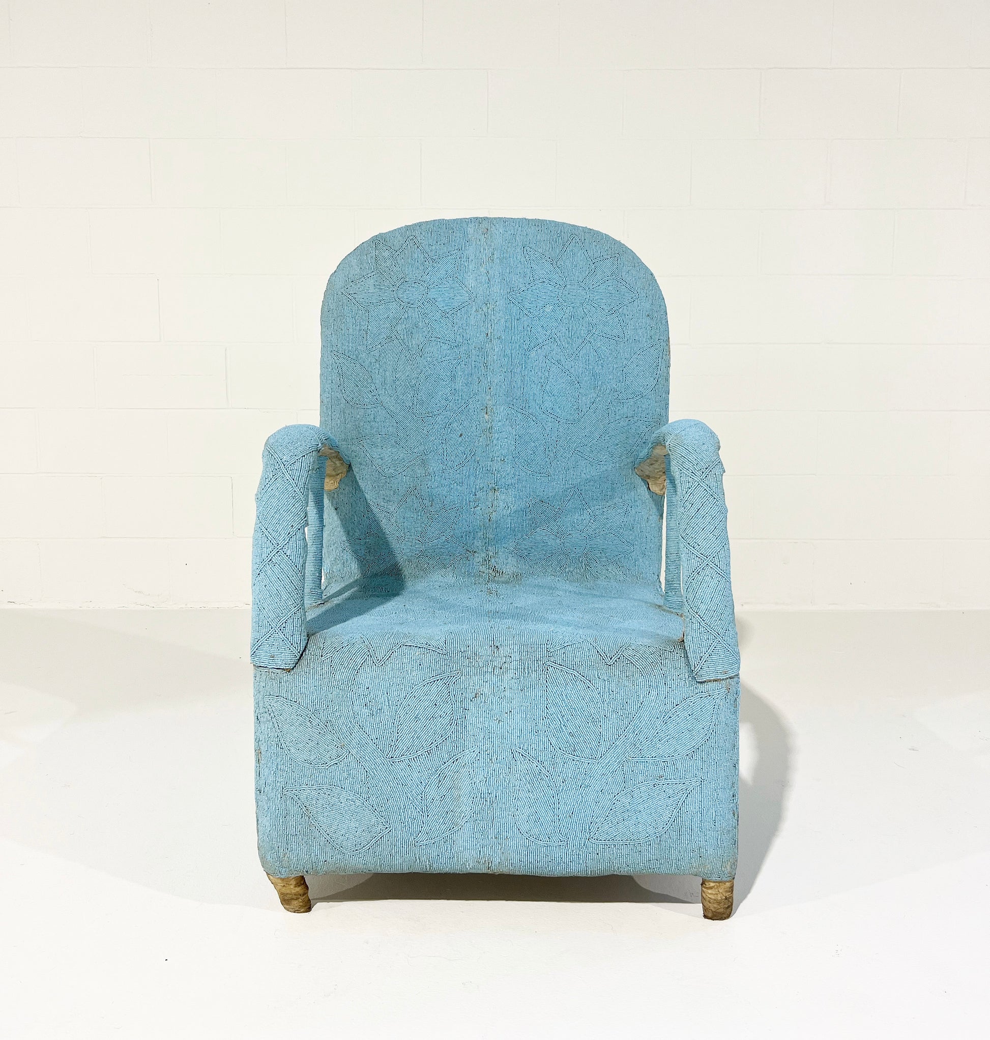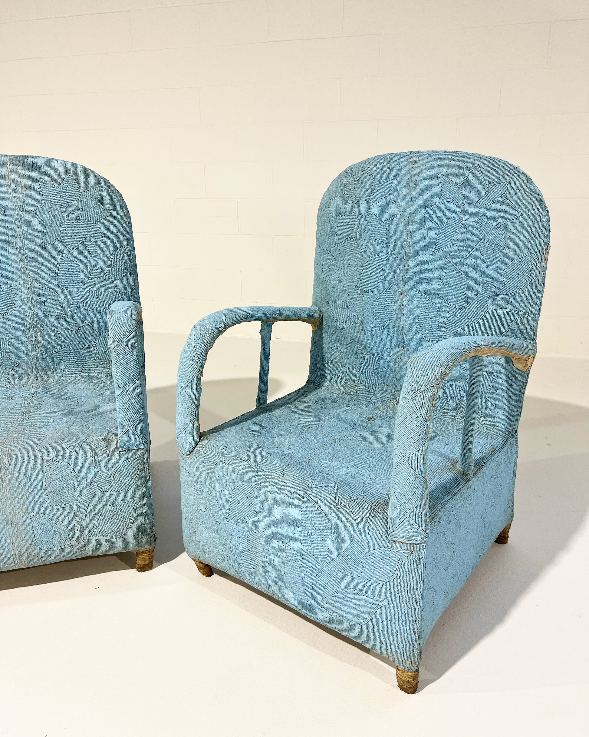 Originally hand-crafted for the Nigerian Yoruba tribe kings and queens, each chair takes approximately 3 months to make. Thousands of tiny glass beads are intricately applied to canvas fabric in beautiful shapes and designs. The fabric is then attached and stitched to the chair frame. A painstaking process resulting in an elaborate, one-of-a-kind work of art. We love these Yoruba chairs. They are worldly folk art that can dress up a corner of the room. Plus, the chairs are comfortable!