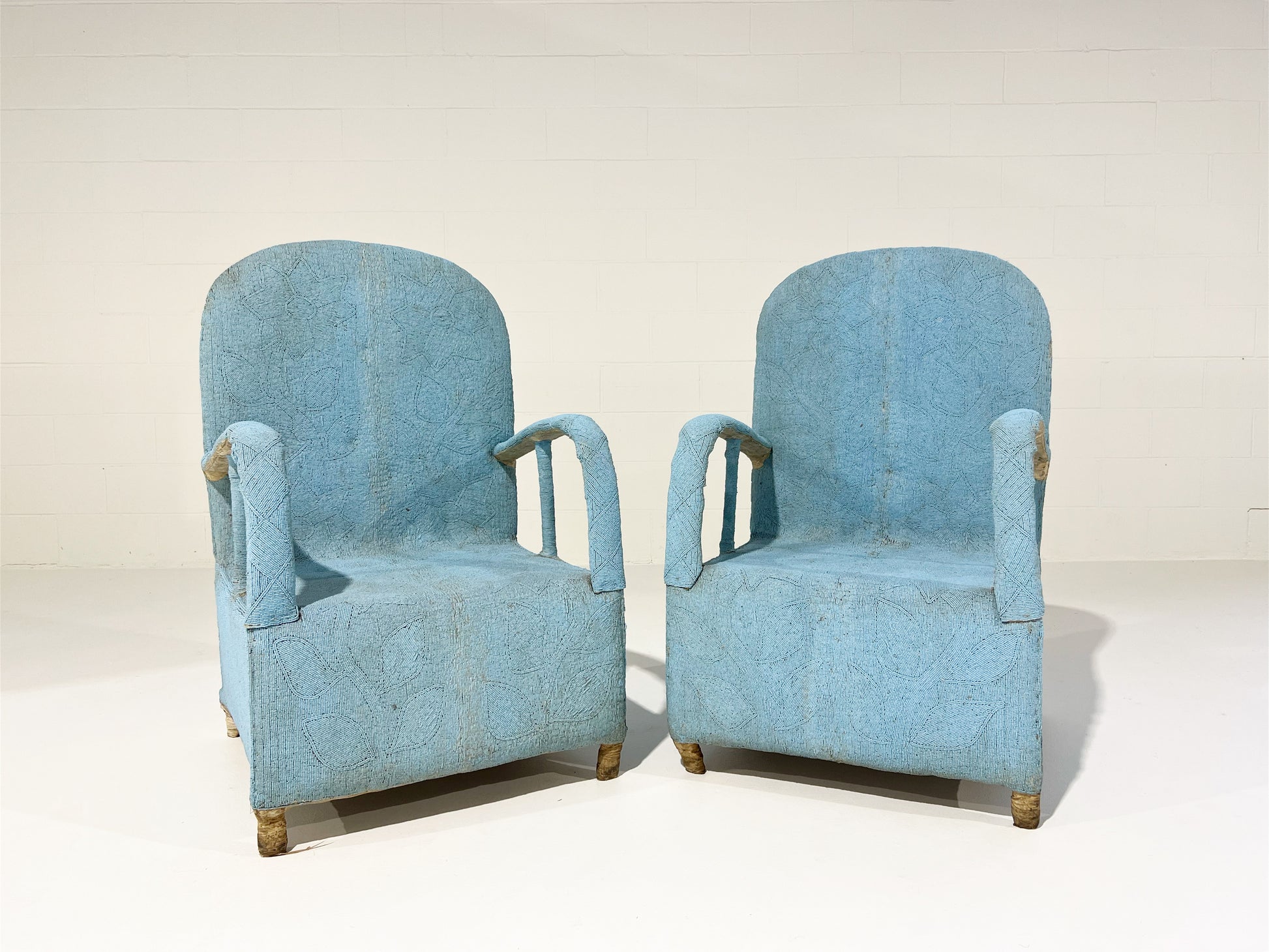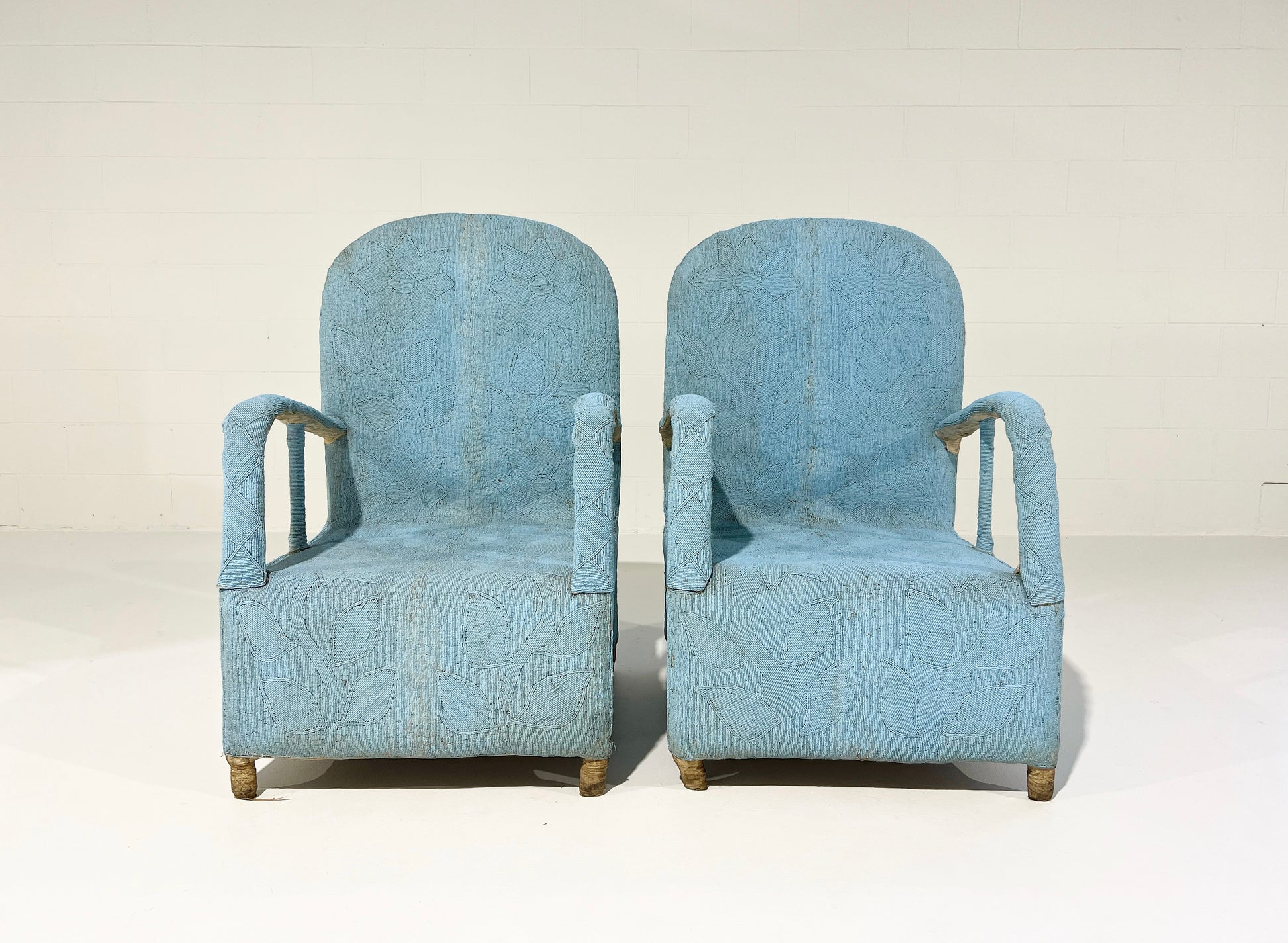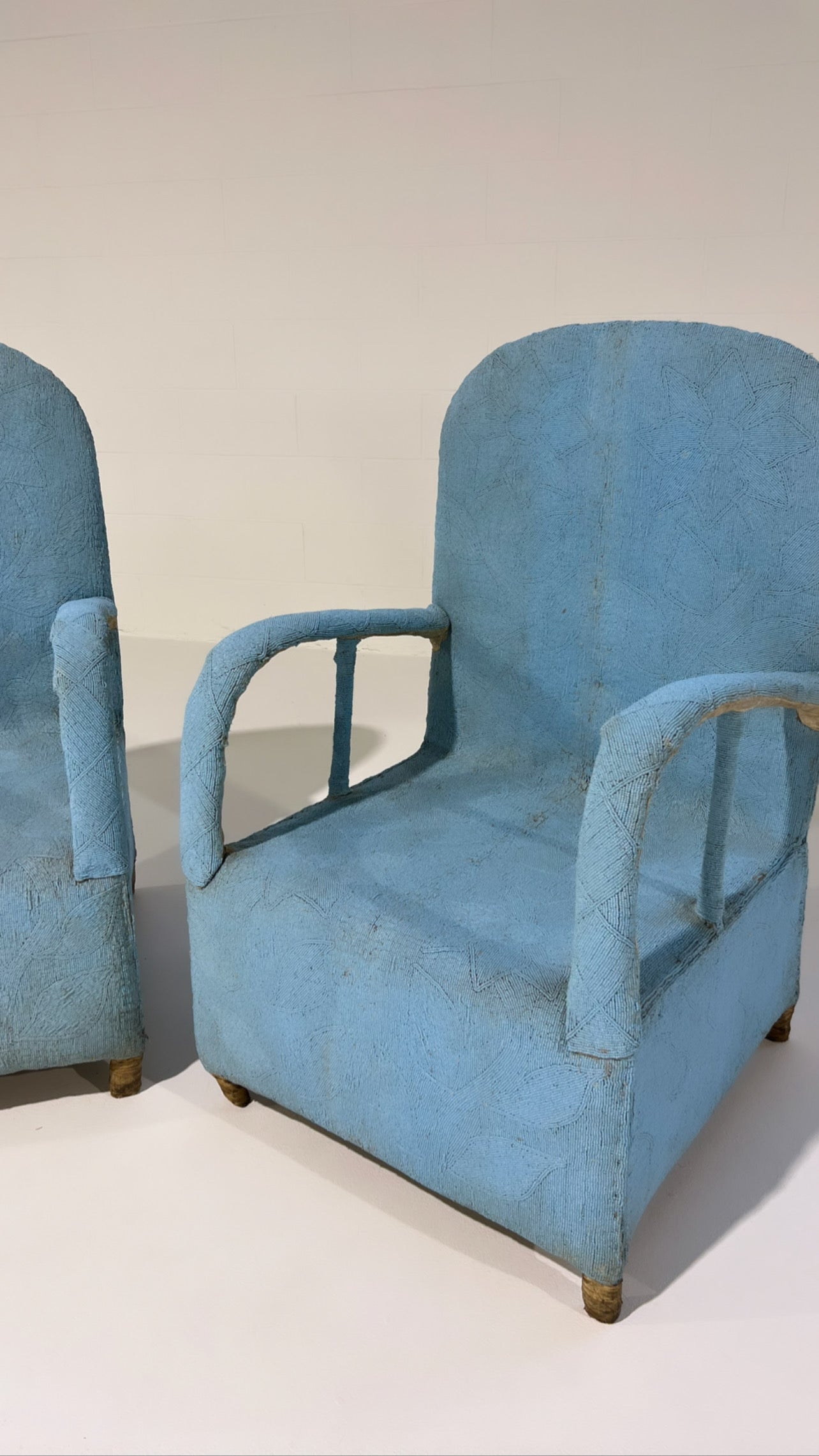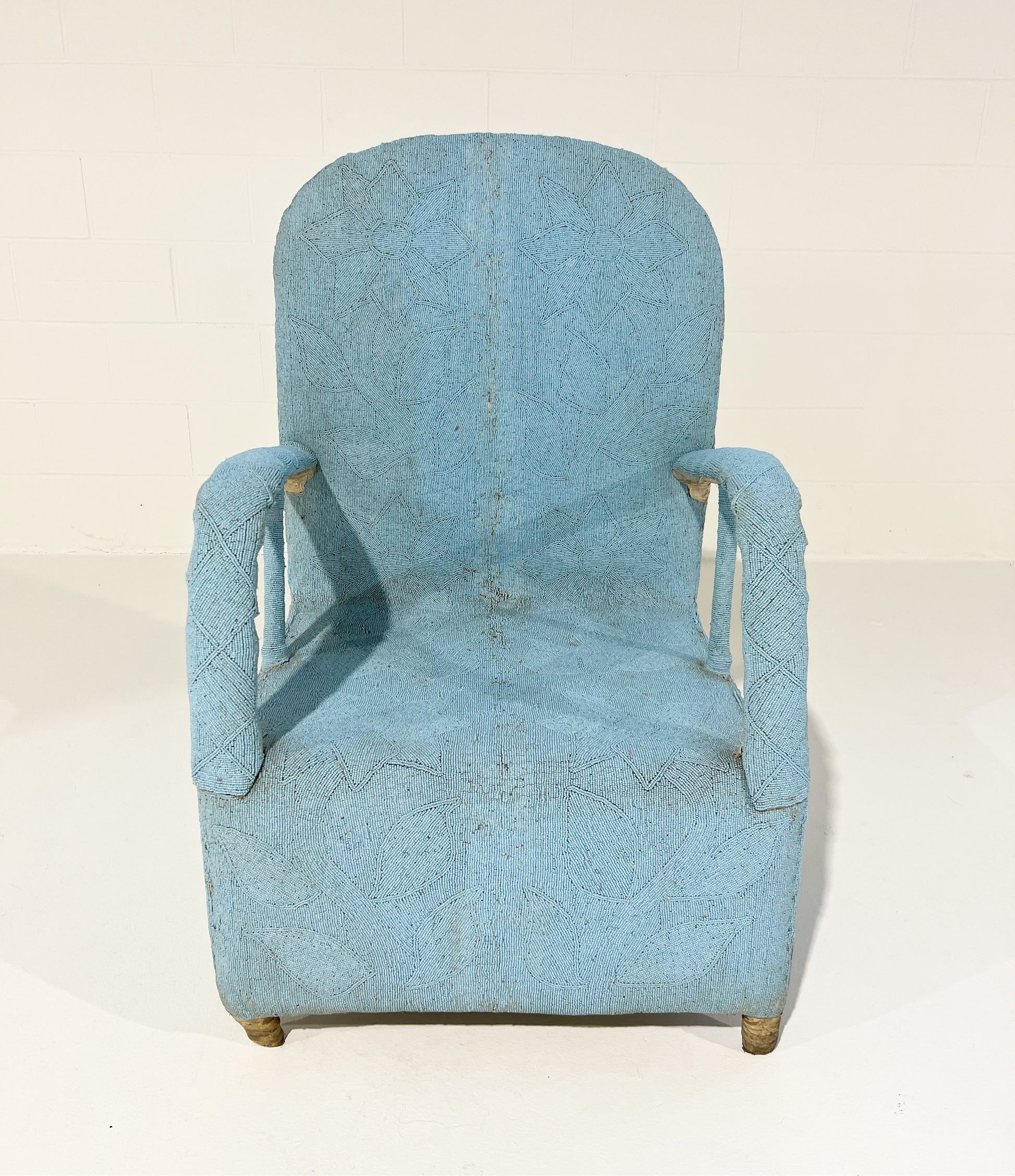 Originally hand-crafted for the Nigerian Yoruba tribe kings and queens, each chair takes approximately 3 months to make. Thousands of tiny glass beads are intricately applied to canvas fabric in beautiful shapes and designs. The fabric is then attached and stitched to the chair frame. A painstaking process resulting in an elaborate, one-of-a-kind work of art. We love these Yoruba chairs. They are worldly folk art that can dress up a corner of the room. Plus, the chairs are comfortable!