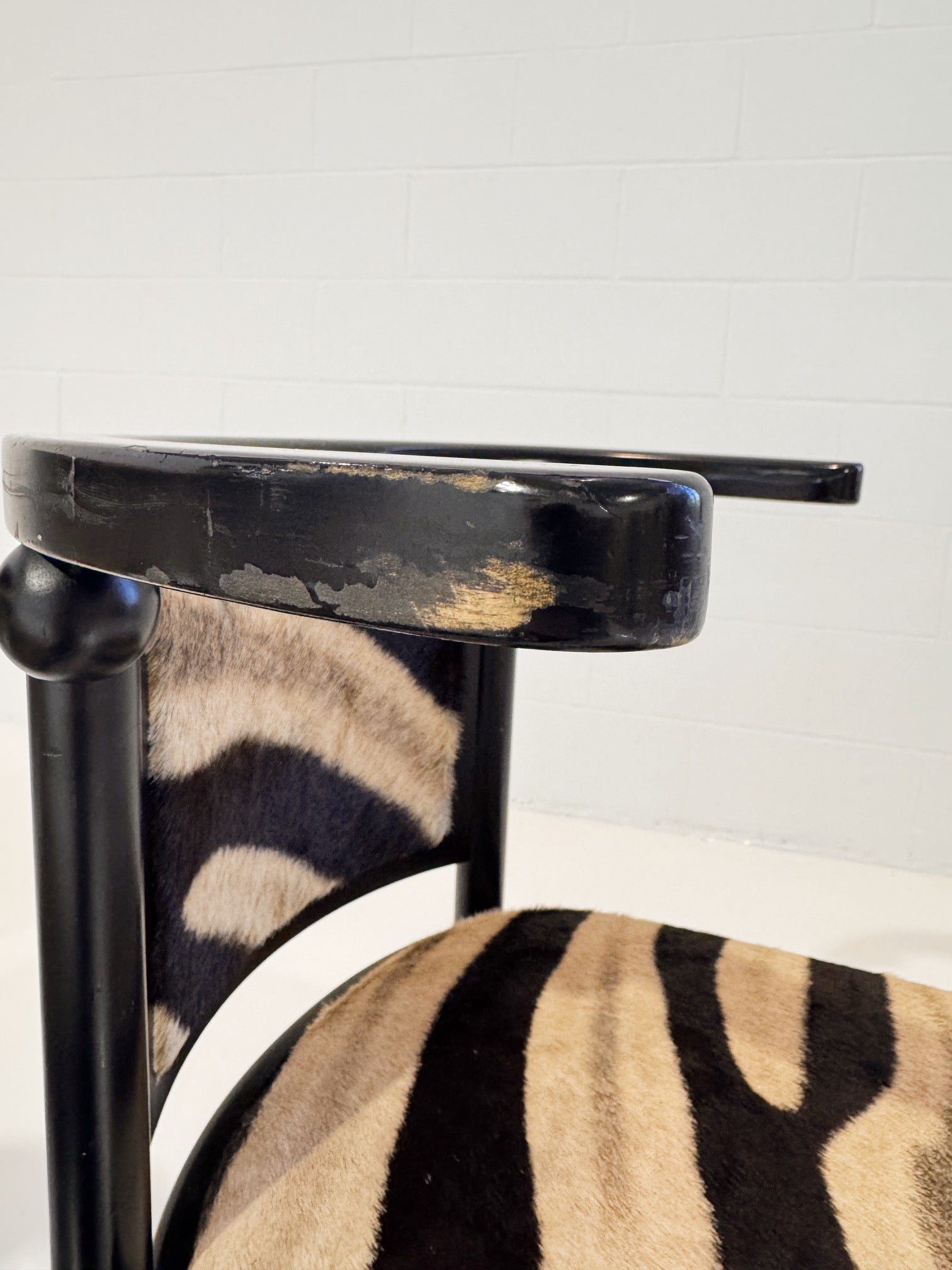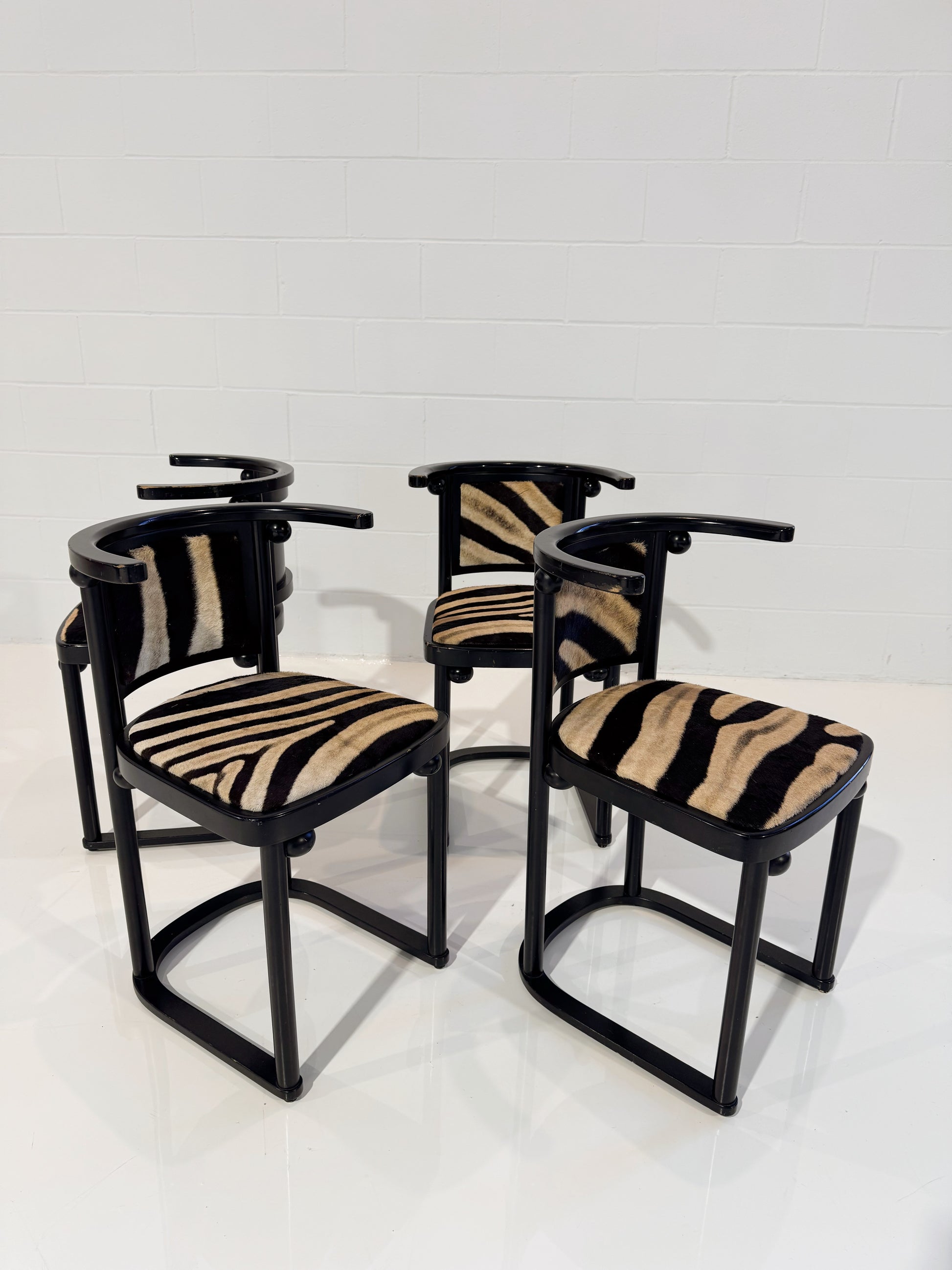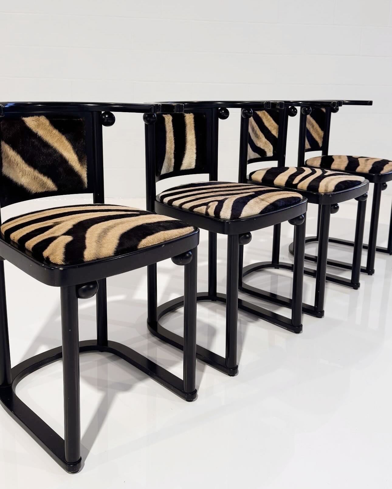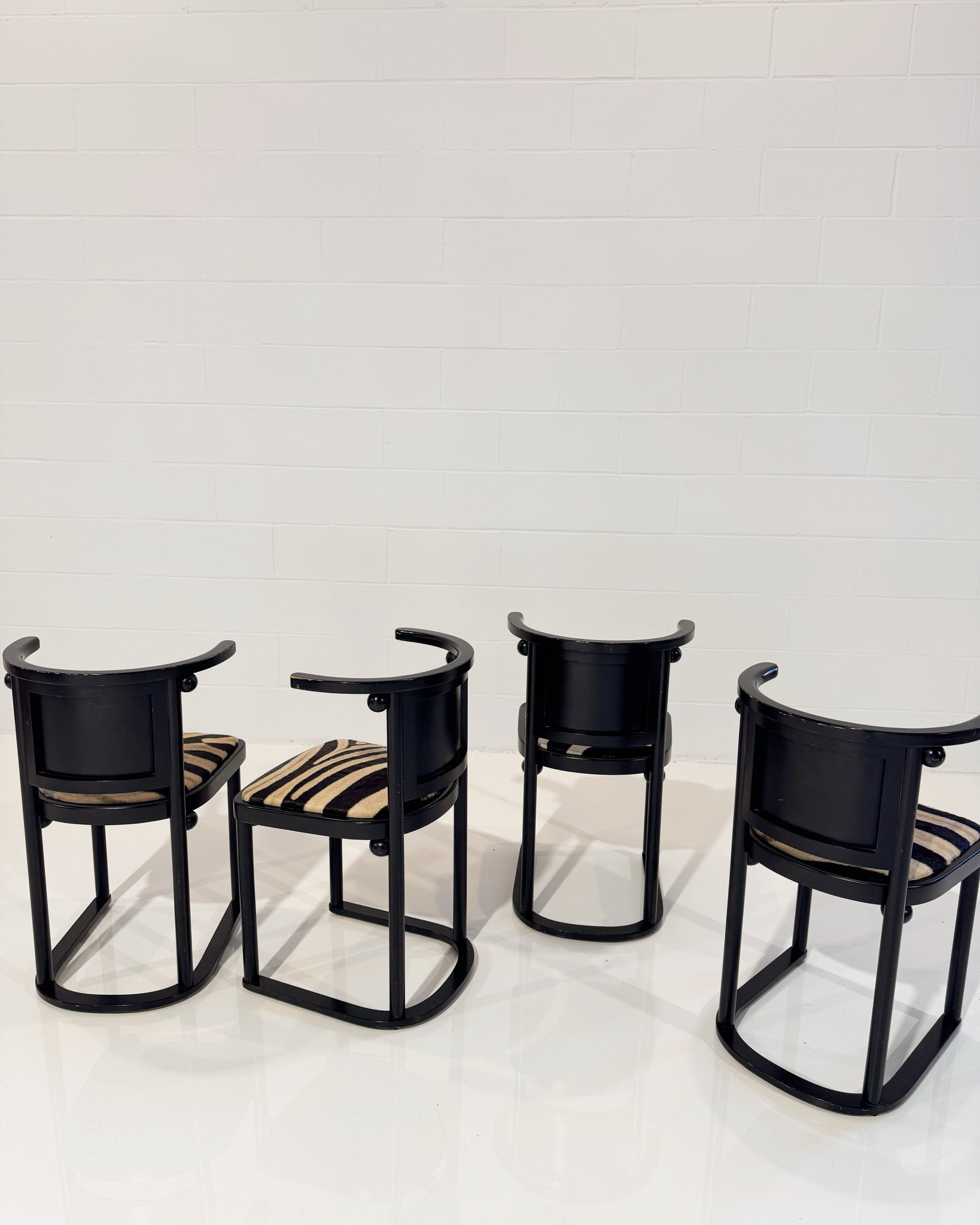 Designed in 1906 by Josef Hoffmann for the Wiener Werkstatte and featured in the J. & J. Kohn catalogues as model no. 728, Hoffmann chose this design for the seating in Vienna's Cabaret Fledermaus that opened in October 1907. For the time the design was a bold and radical departure from the gilded tradition of European nightclubs and instantly gained popularity. This matching set of 4 chairs was manufactured by Alivar in 1992.