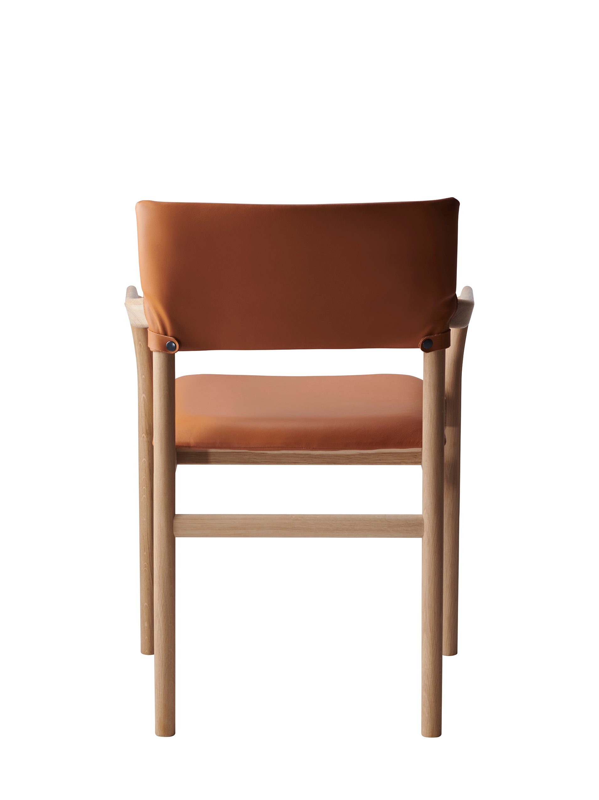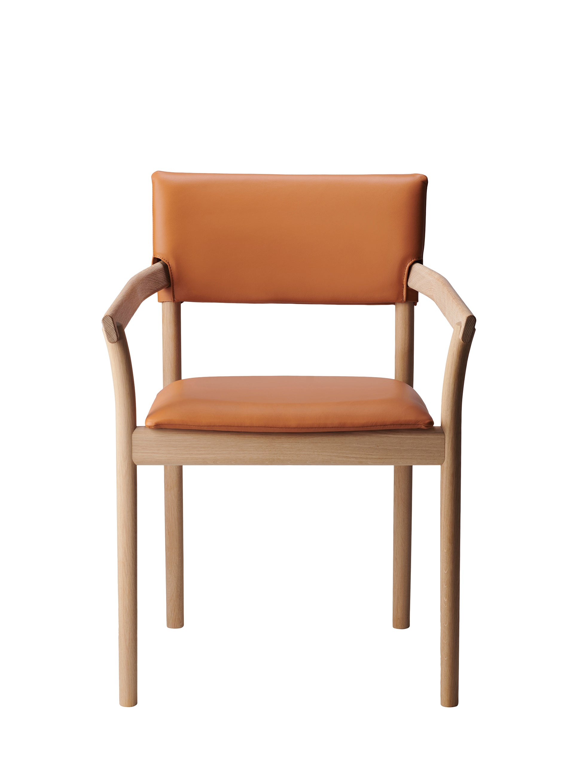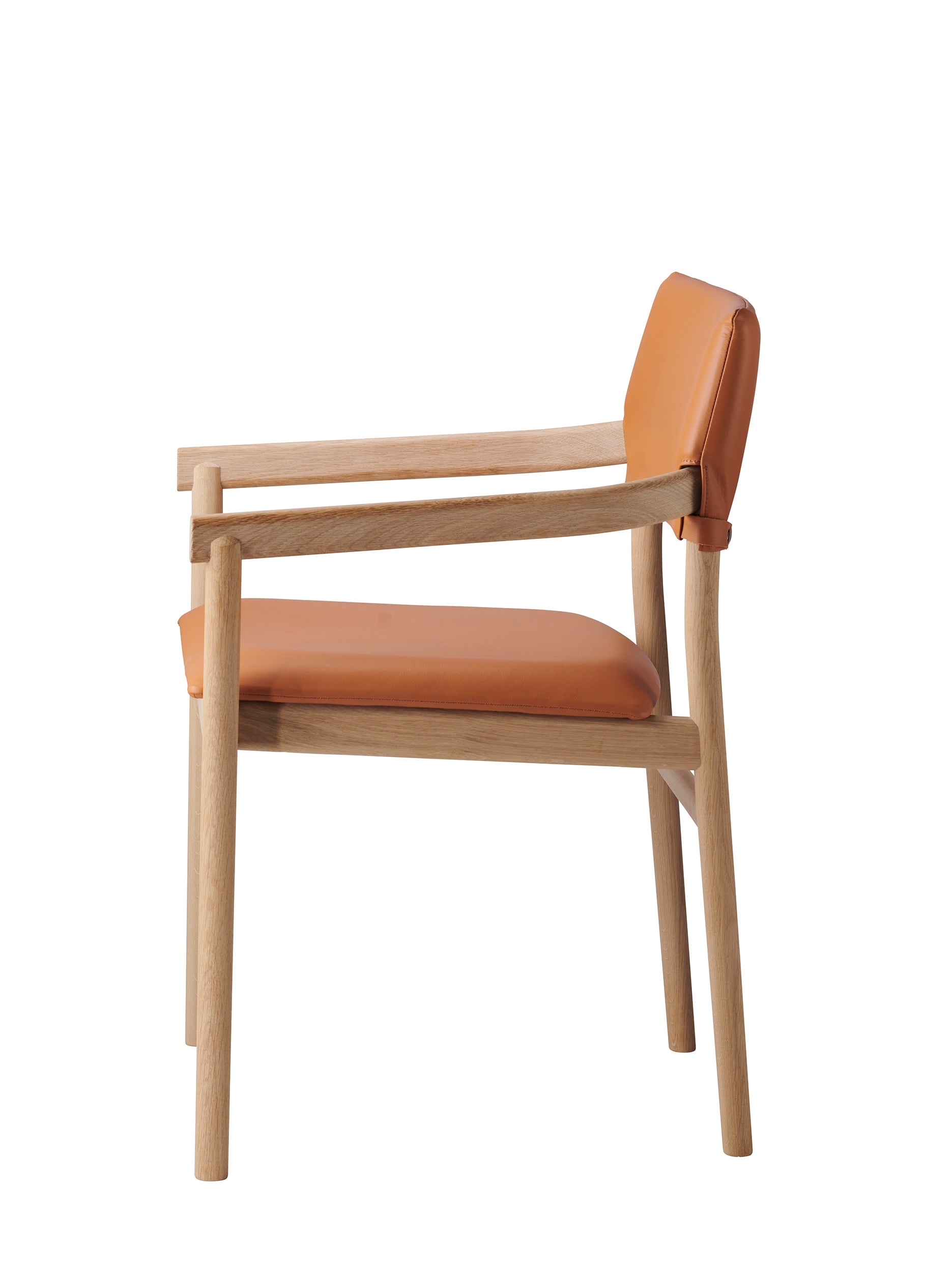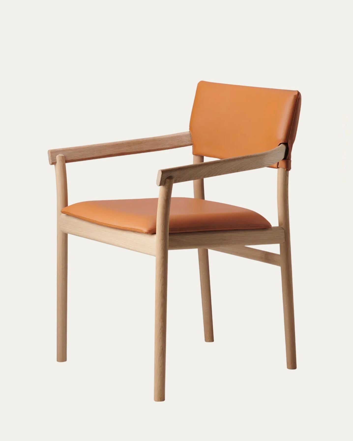 Designed in 2024, the Vyn armchair is a beautiful dining chair comprised of a solid oak frame with front and back legs in solid bent wood. Upholstered seat and backrest in veneer. Available with an upholstered backrest in fabric or leather.