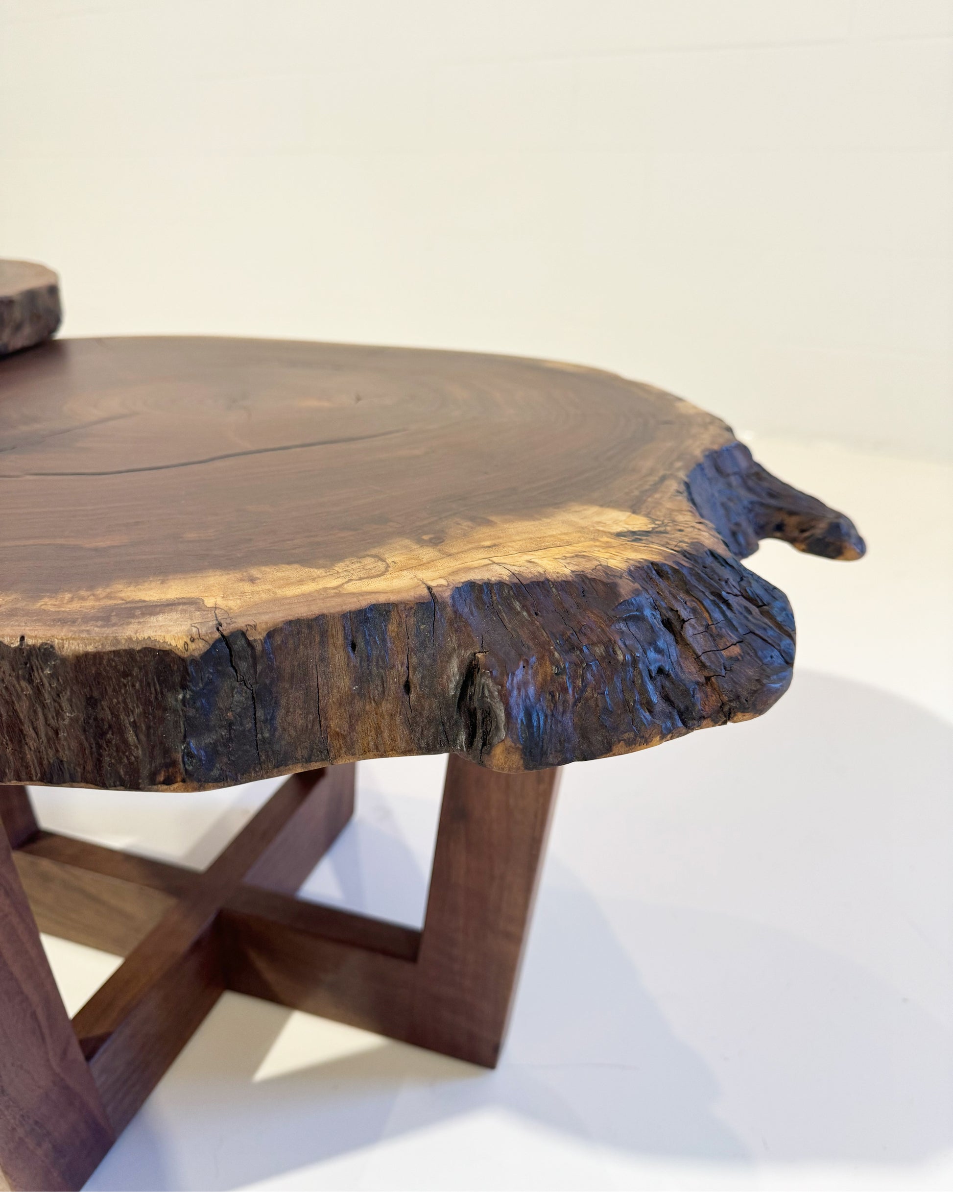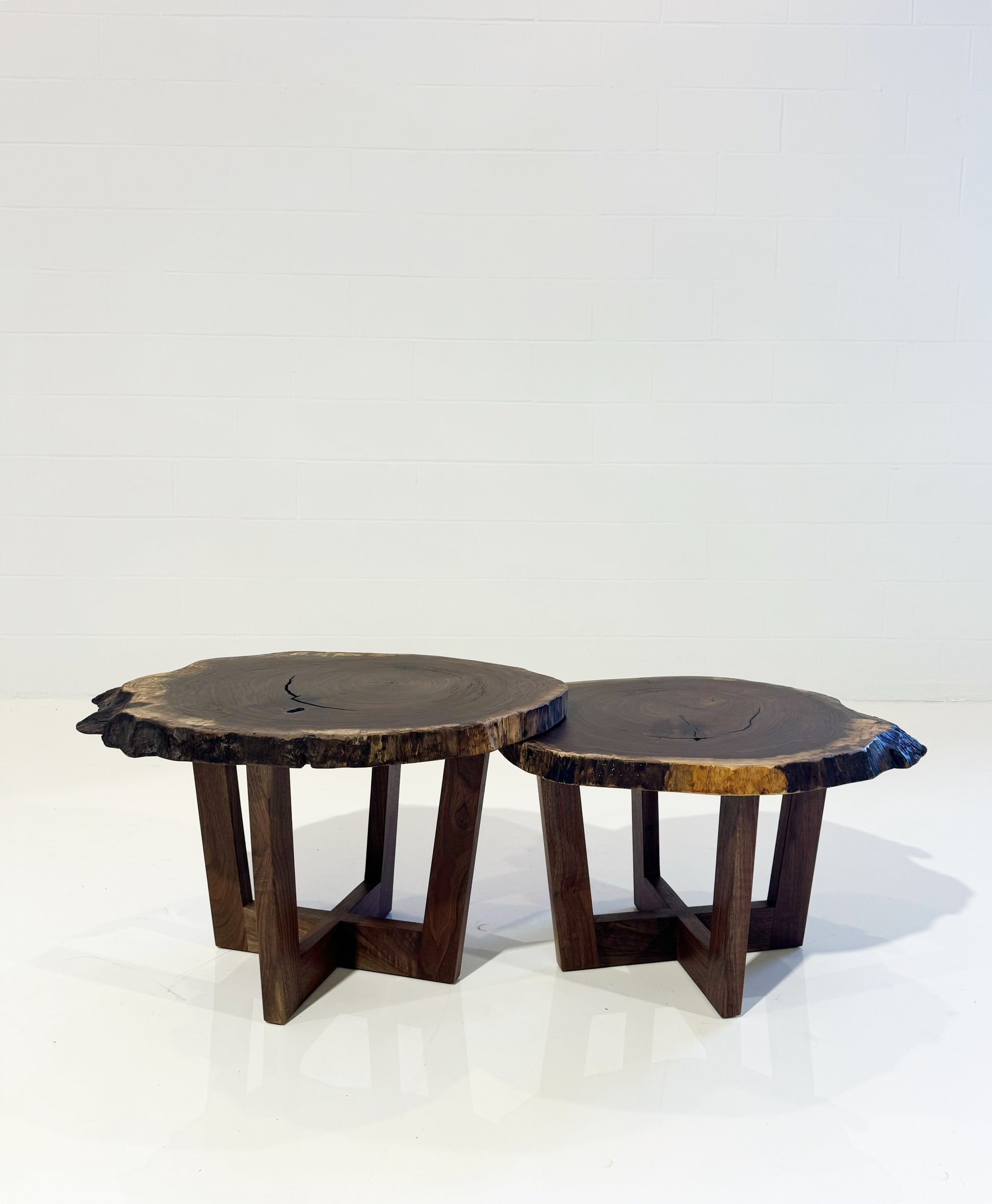 A beautiful, one-of-a-kind set of nesting coffee tables. Handcrafted from gorgeous walnut burl slabs. Would make nice side tables too.