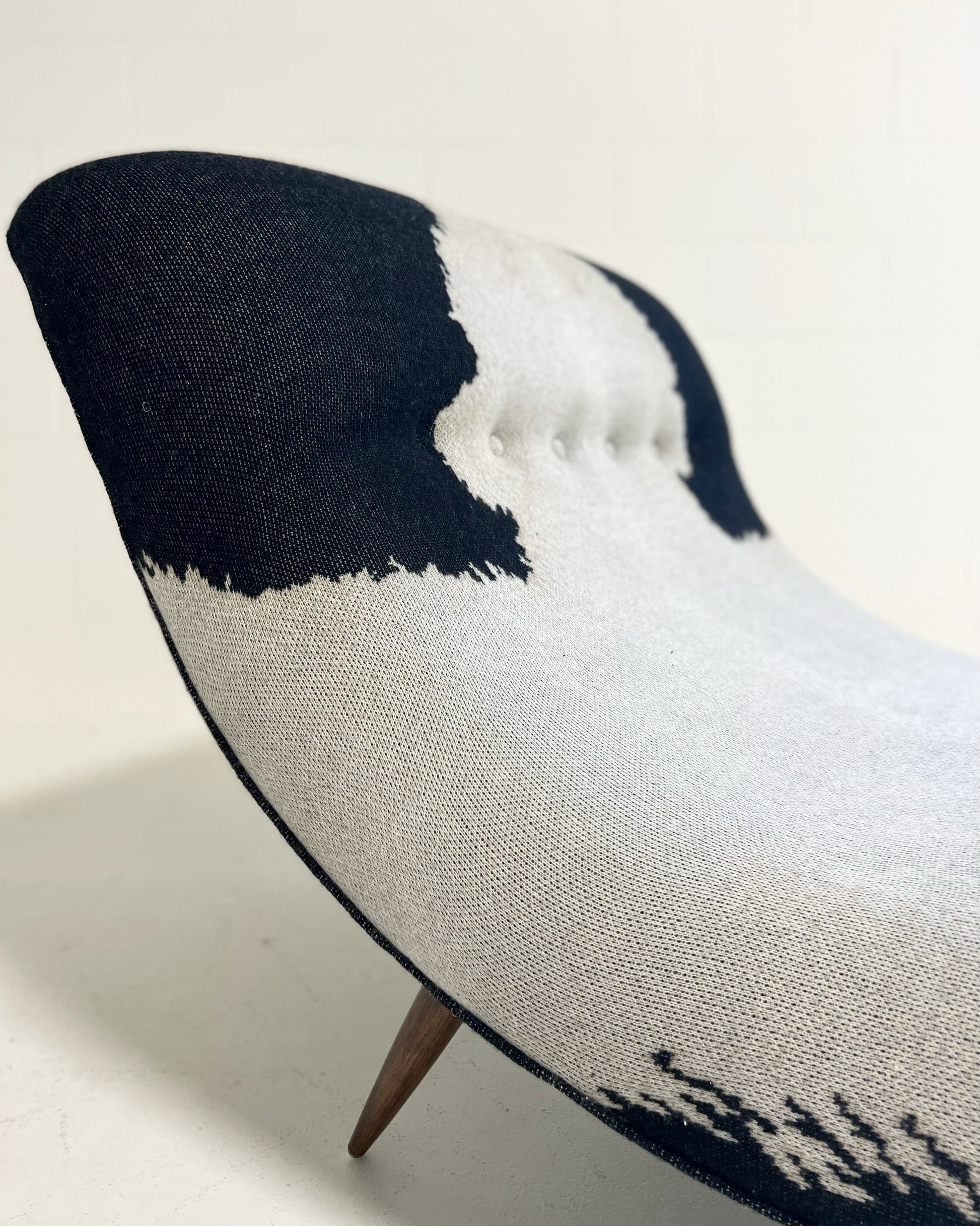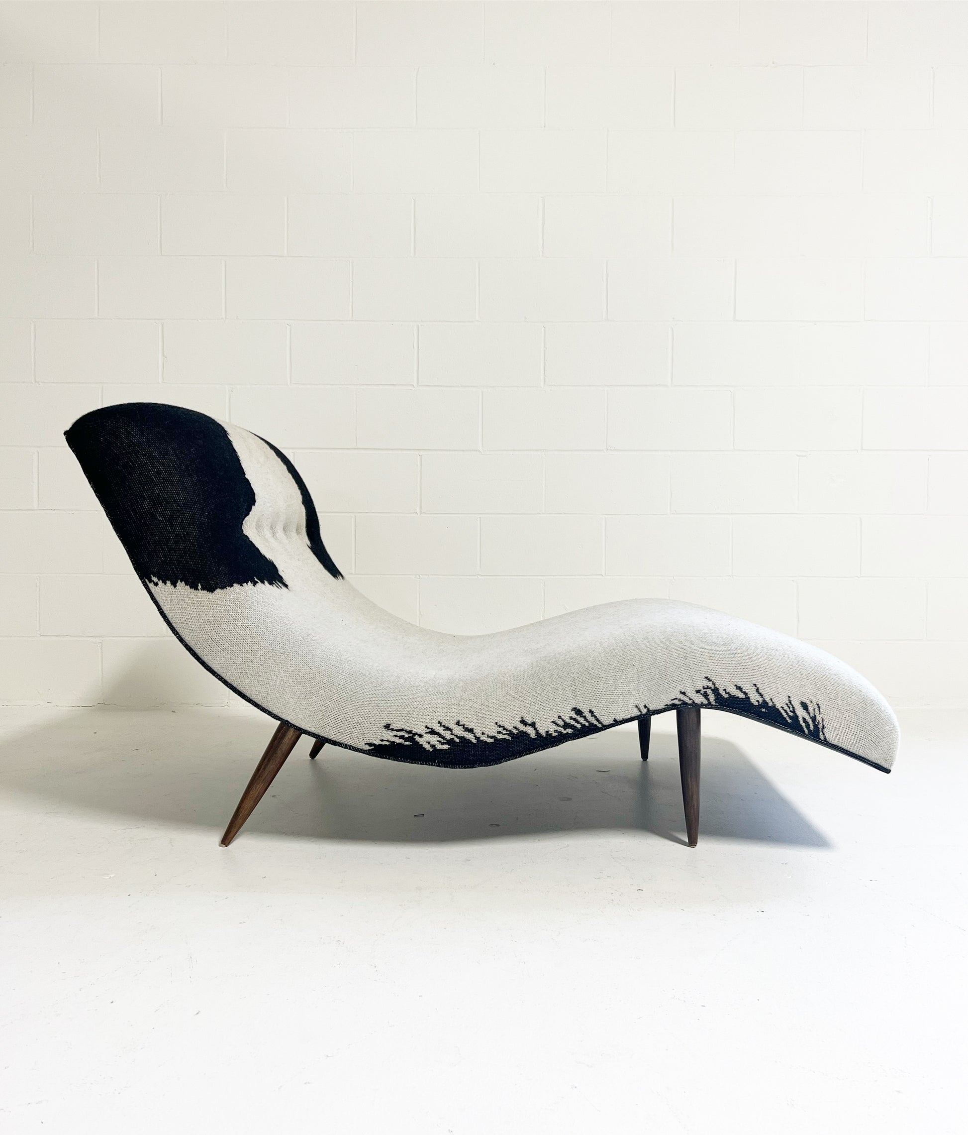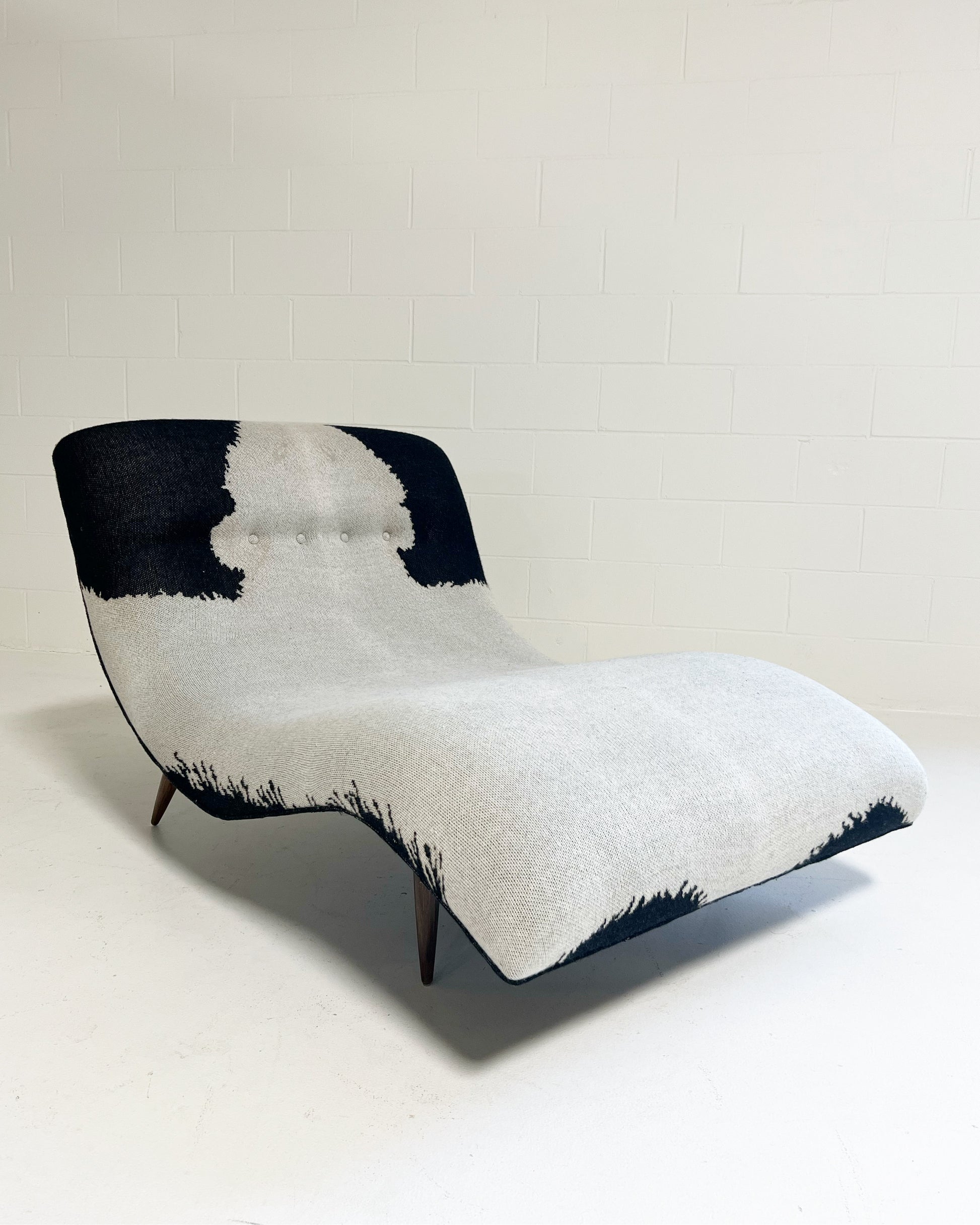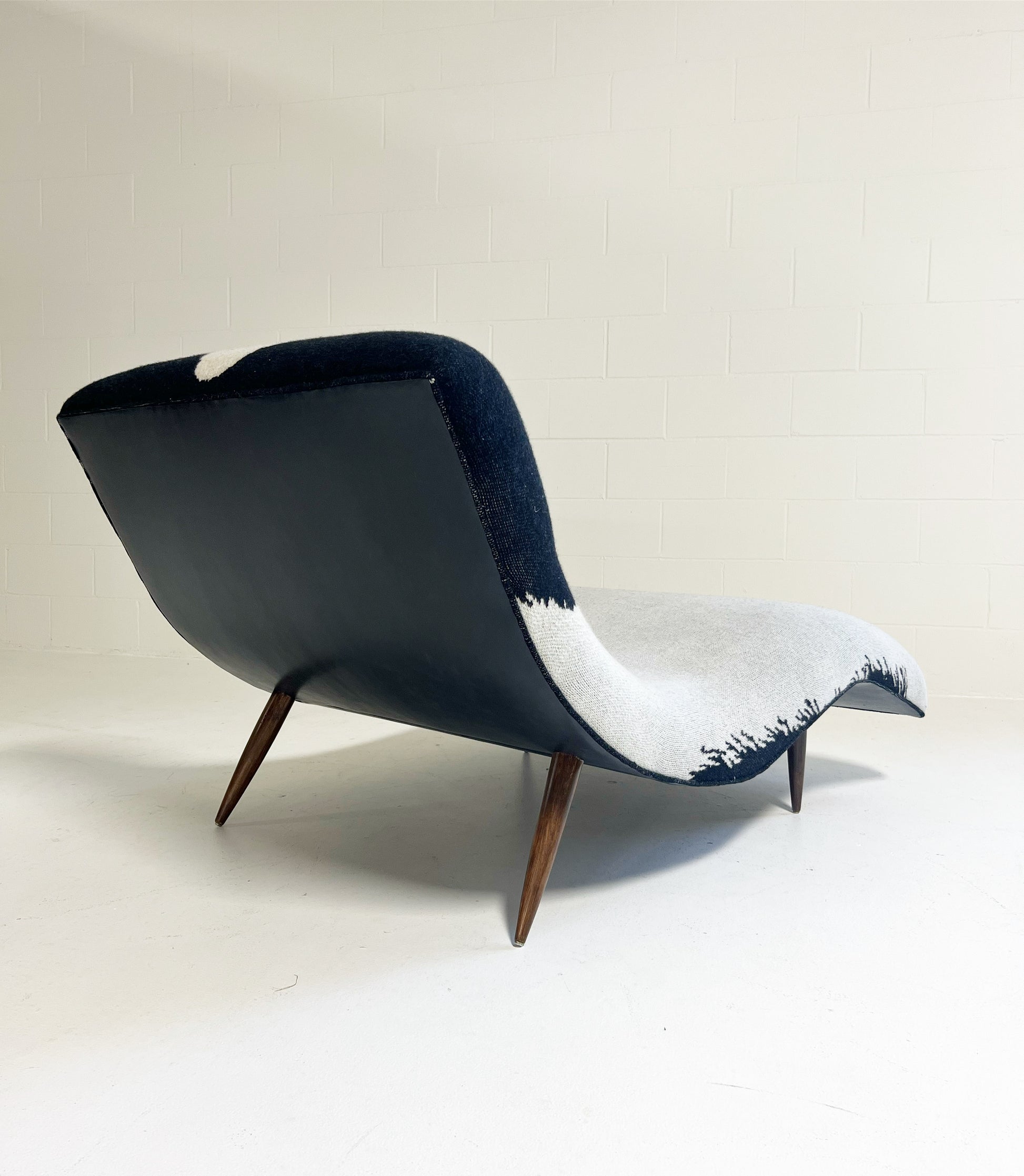 This is an original Adrian Pearsall wave chaise lounge. Adrian Pearsall began his career as an architect but dabbled in furniture design, quickly becoming a leader in the modernist furniture movement. We upholstered the lounge with a cashmere throw from one of favorite brands, Saved NY. The throw beautifully depicts a Polar Bear drawing. How appropriate as this is a perfect "snug down all winter long" piece. Finished in black leather on the underside, we picture it in the corner of a bedroom or the centerpiece in a living room.