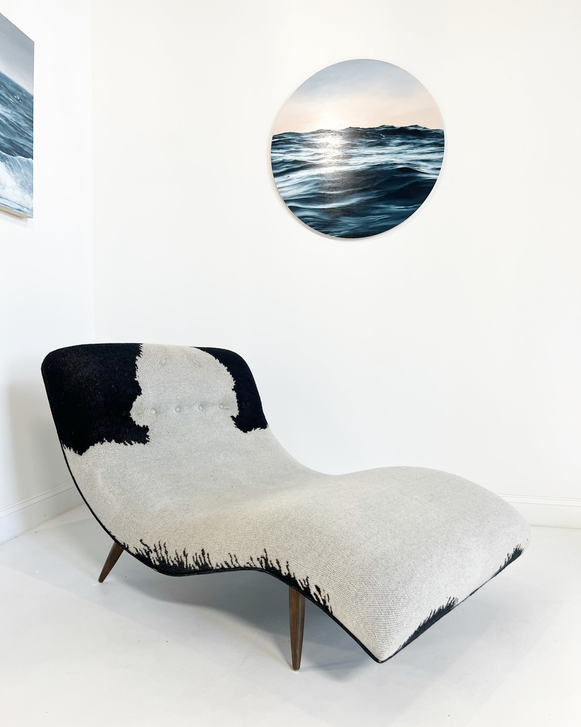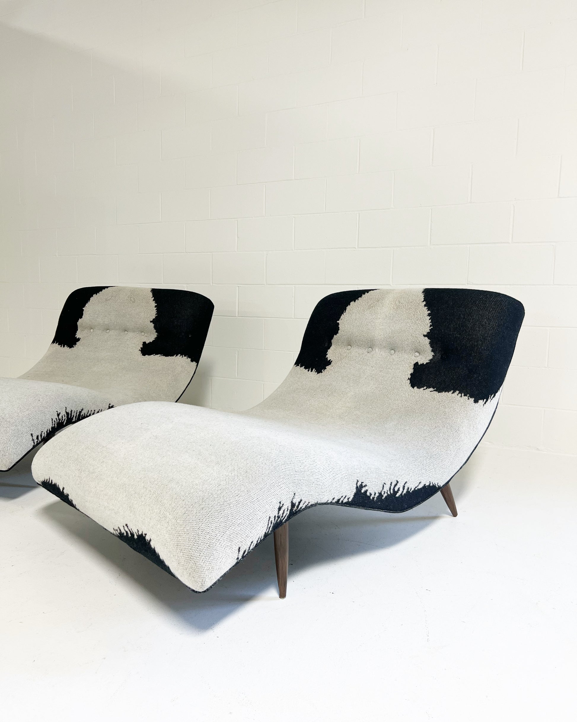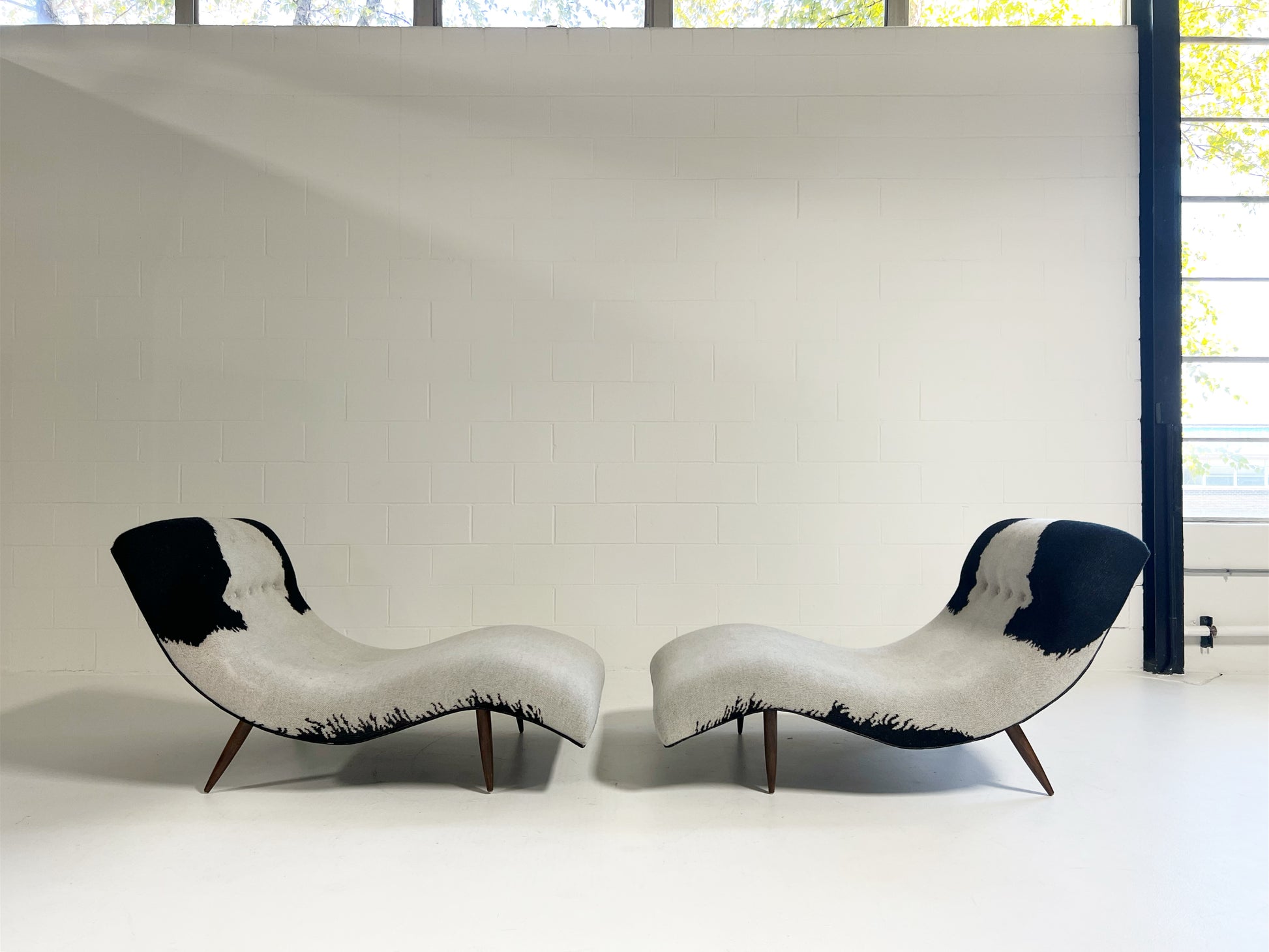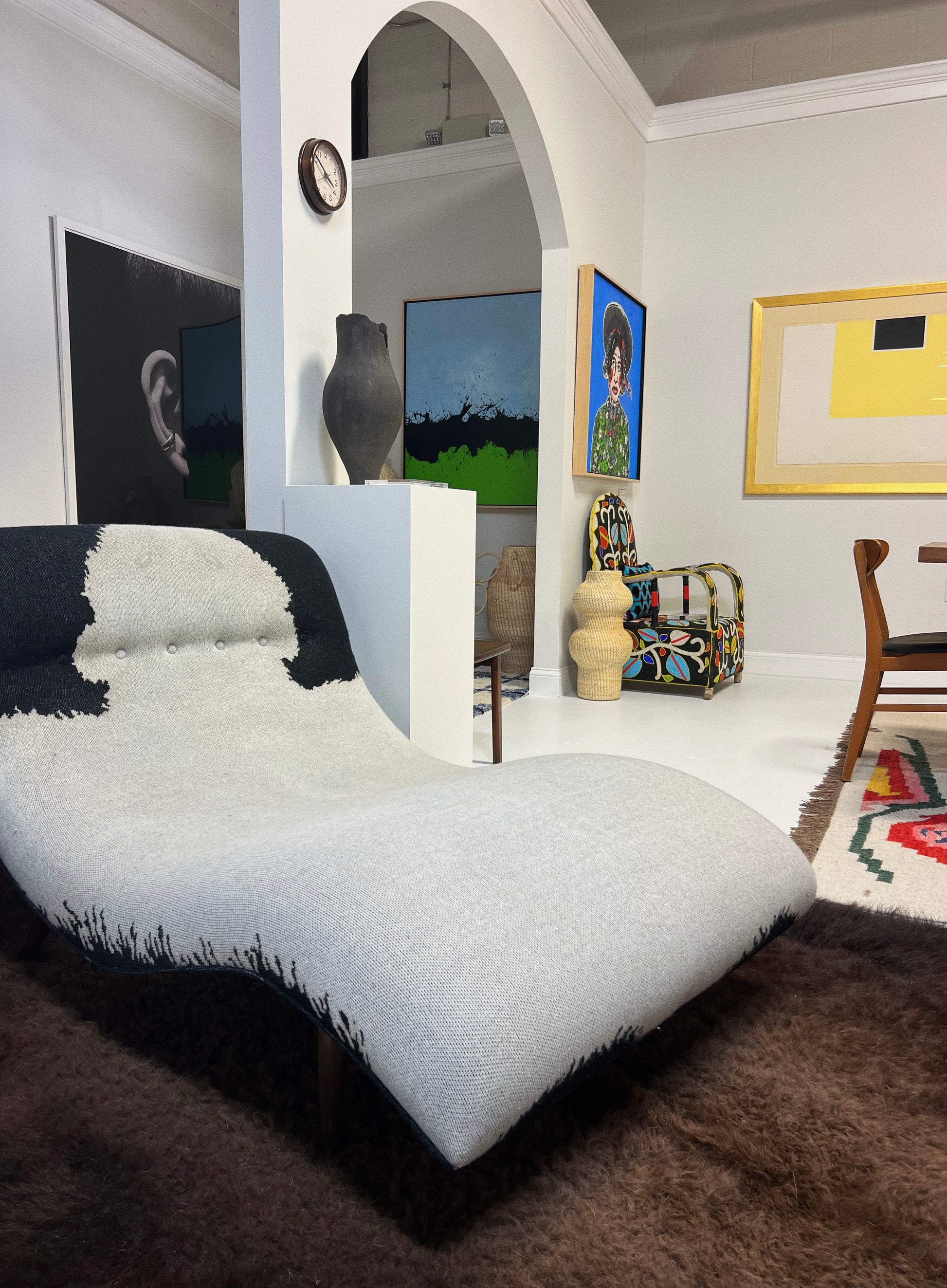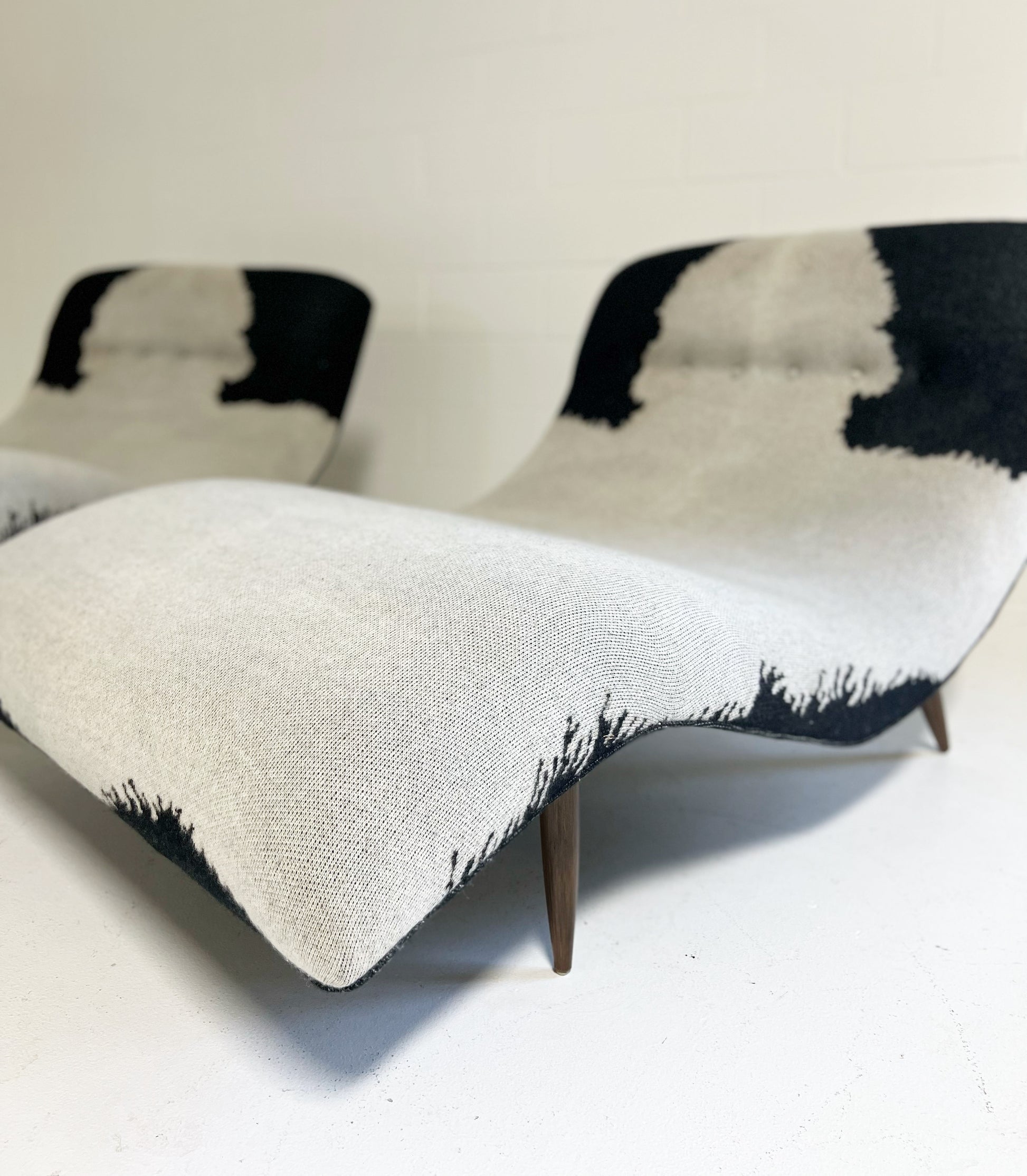 This is an original Adrian Pearsall wave chaise lounge. Adrian Pearsall began his career as an architect but dabbled in furniture design, quickly becoming a leader in the modernist furniture movement. We upholstered the lounge with a cashmere throw from one of favorite brands, Saved NY. The throw beautifully depicts a Polar Bear drawing. How appropriate as this is a perfect "snug down all winter long" piece. Finished in black leather on the underside, we picture it in the corner of a bedroom or the centerpiece in a living room.