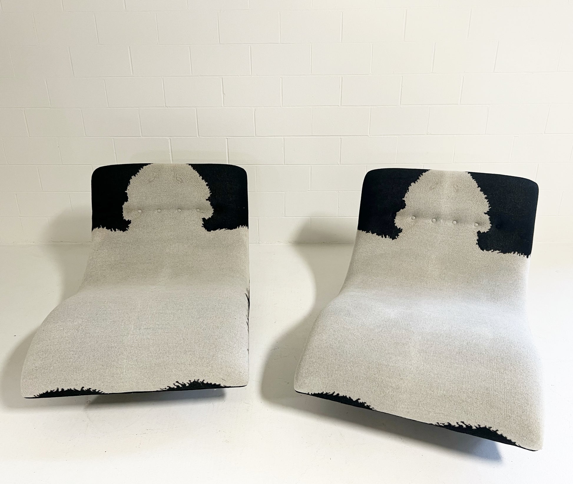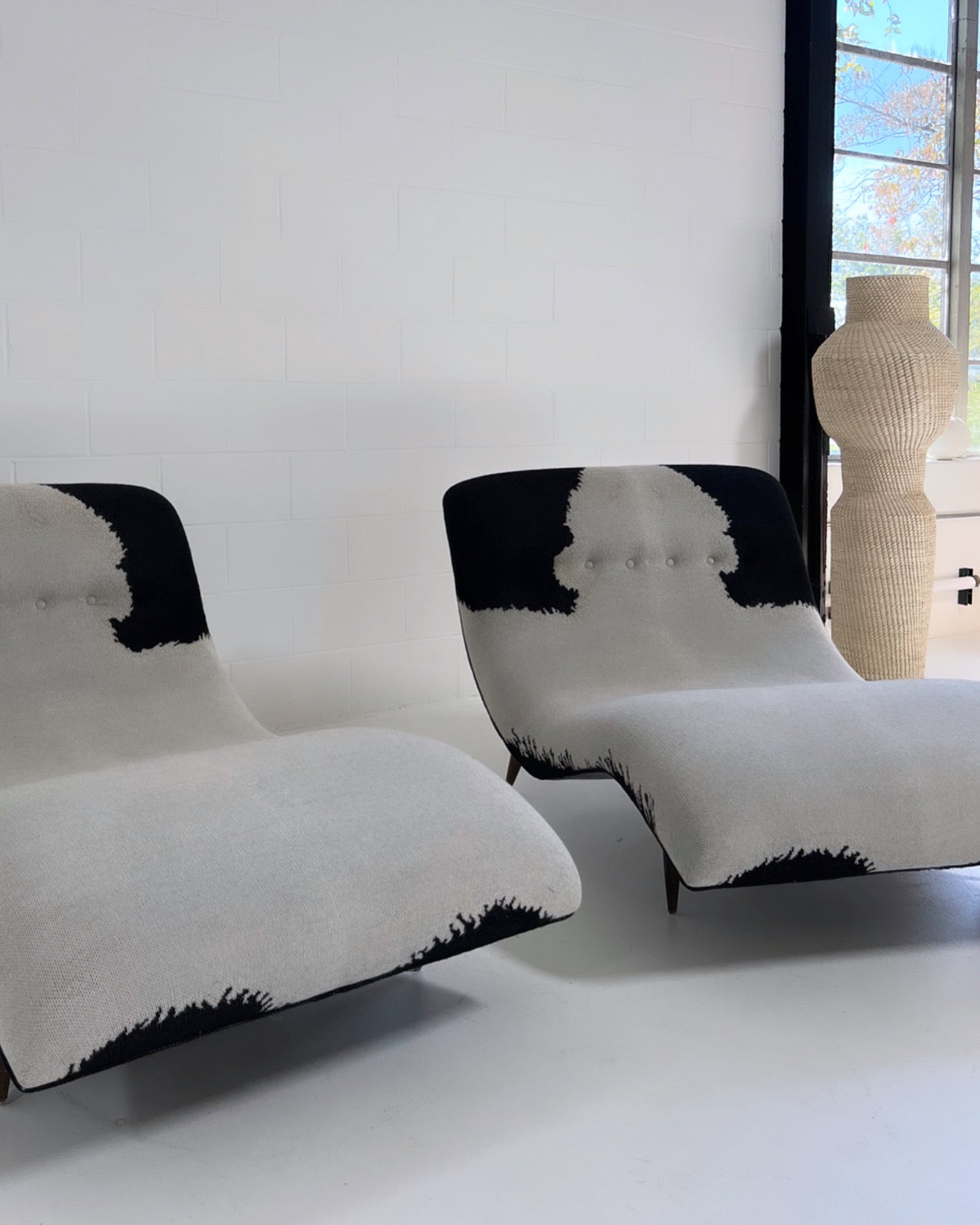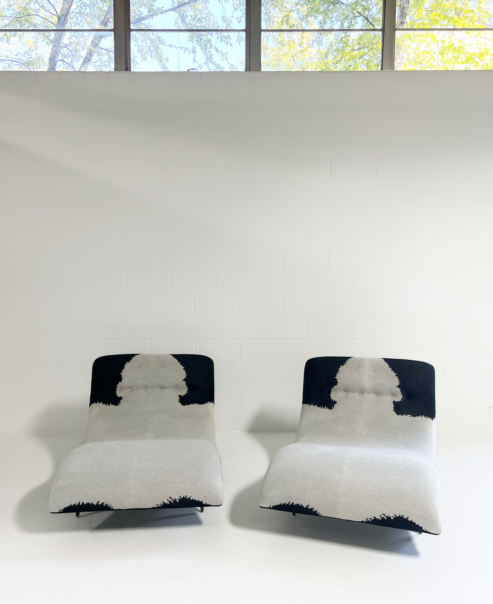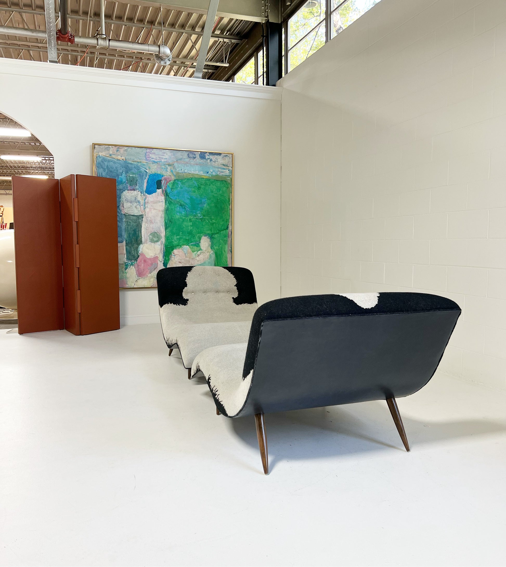 This is an original Adrian Pearsall wave chaise lounge. Adrian Pearsall began his career as an architect but dabbled in furniture design, quickly becoming a leader in the modernist furniture movement. We upholstered the lounge with a cashmere throw from one of favorite brands, Saved NY. The throw beautifully depicts a Polar Bear drawing. How appropriate as this is a perfect "snug down all winter long" piece. Finished in black leather on the underside, we picture it in the corner of a bedroom or the centerpiece in a living room.