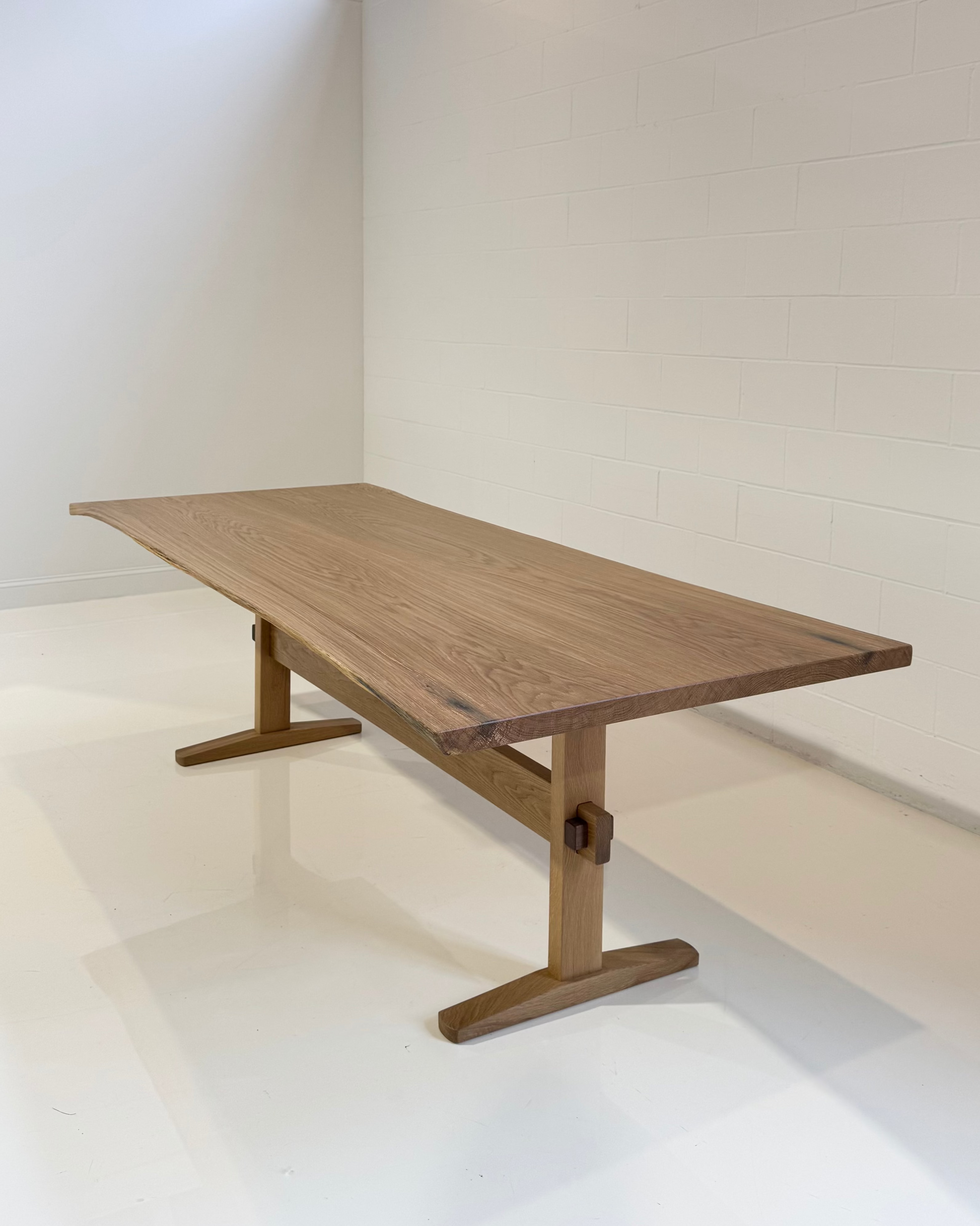 A beautiful dining table handcrafted with sustainably harvested white oak slabs with a gentle live edge.