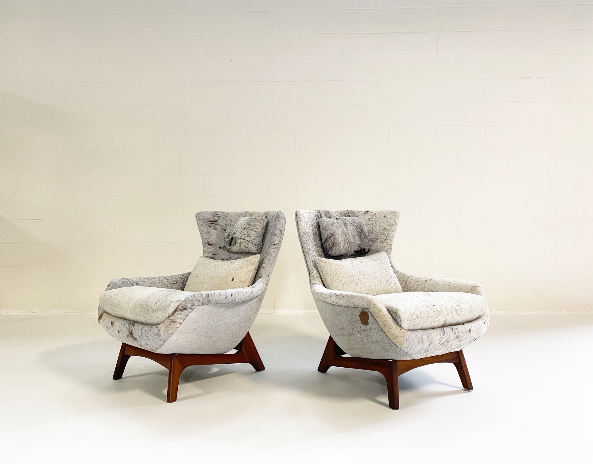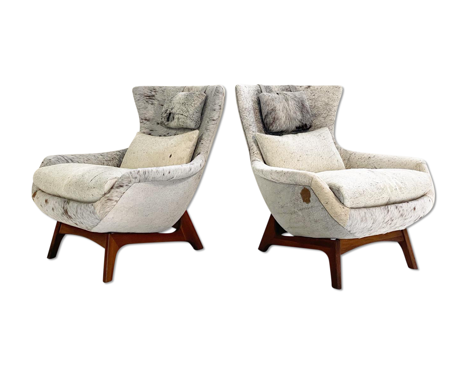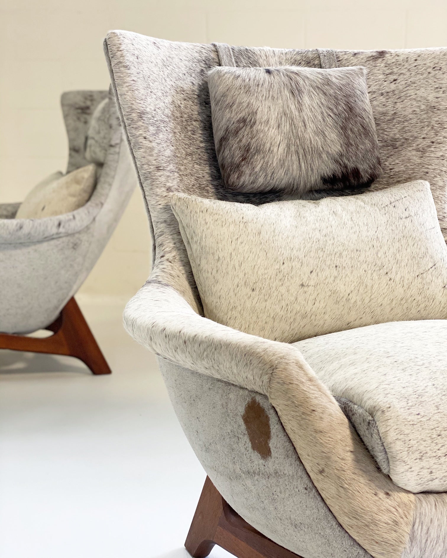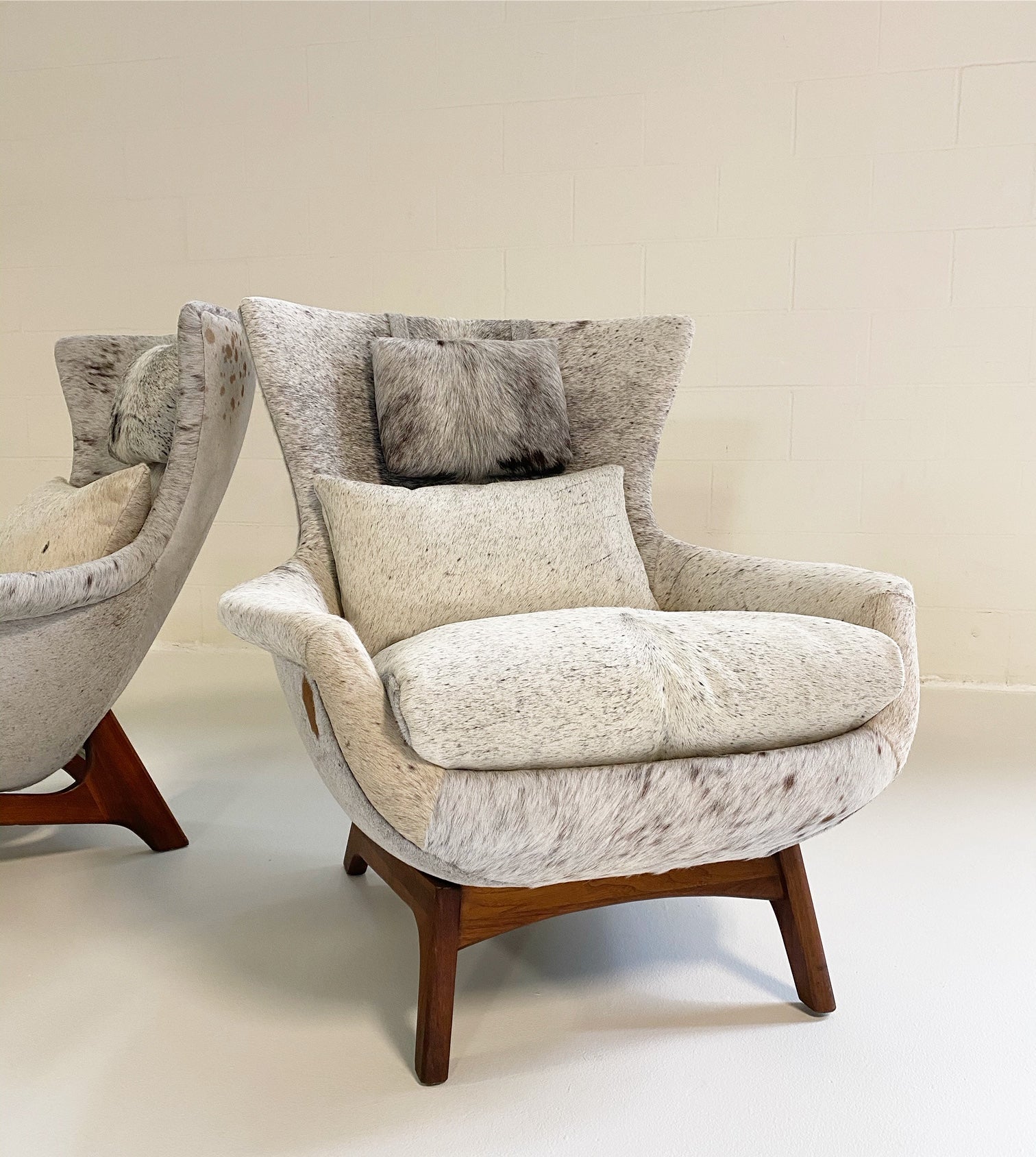 Another prime example of Pearsall's vivacious, swinging 60s iconic designs. And we knew exactly what they needed - our luxuriously soft, silky Brazilian cowhide in a cool tri-color speckled hue. These chairs have been totally restored by our master upholsterers with brand new foam throughout and luxury 100% down-filled cushions. Solid walnut legs.