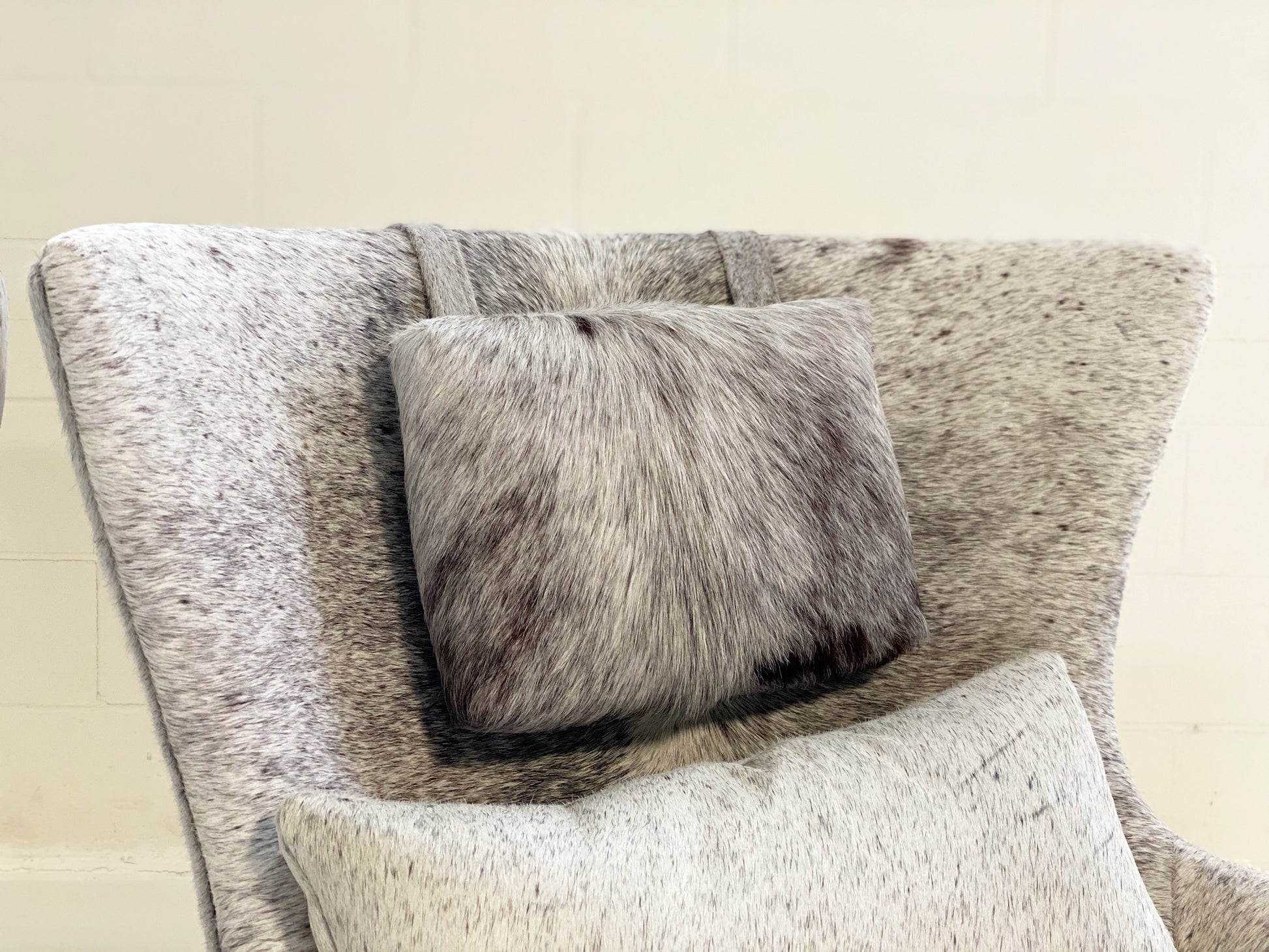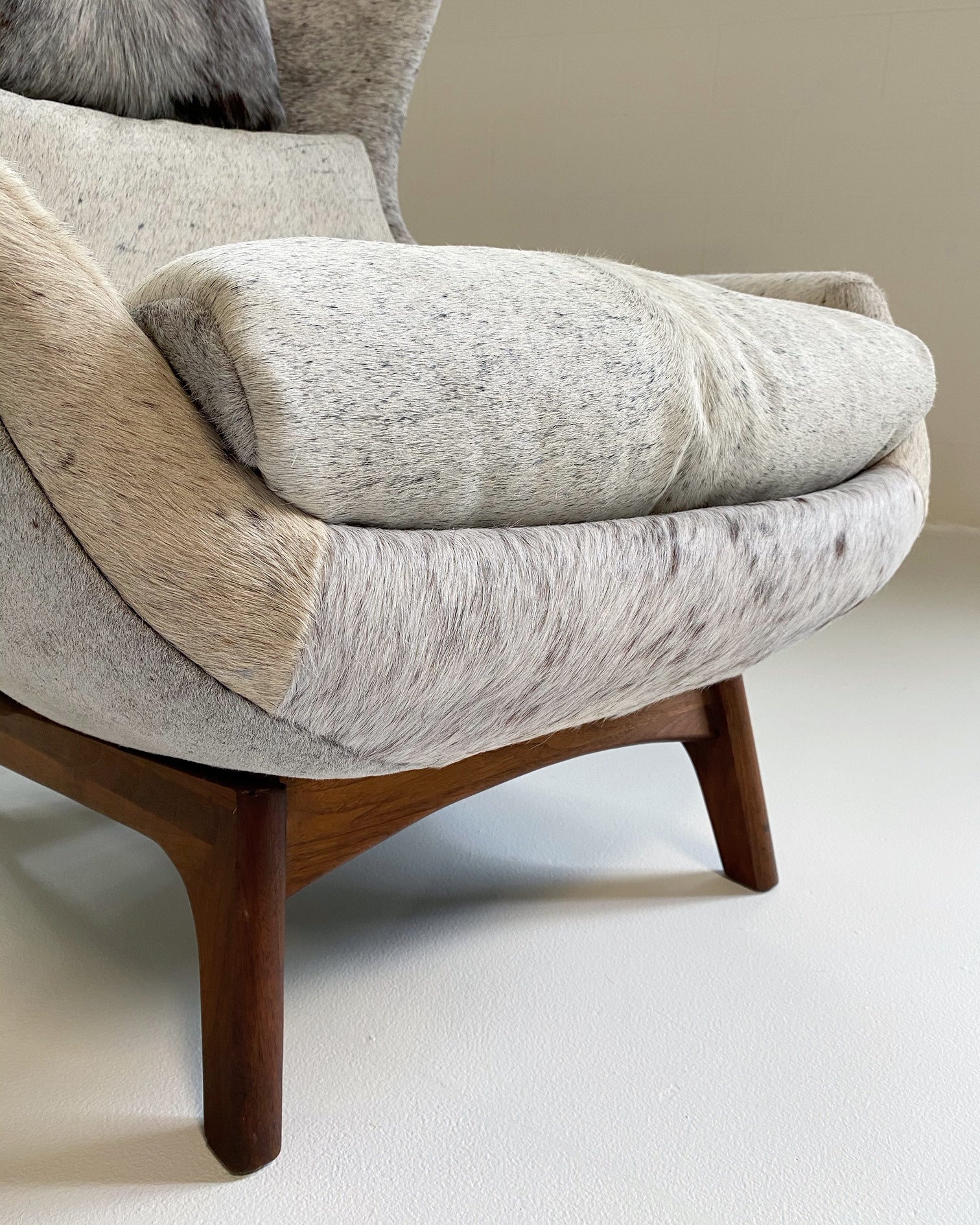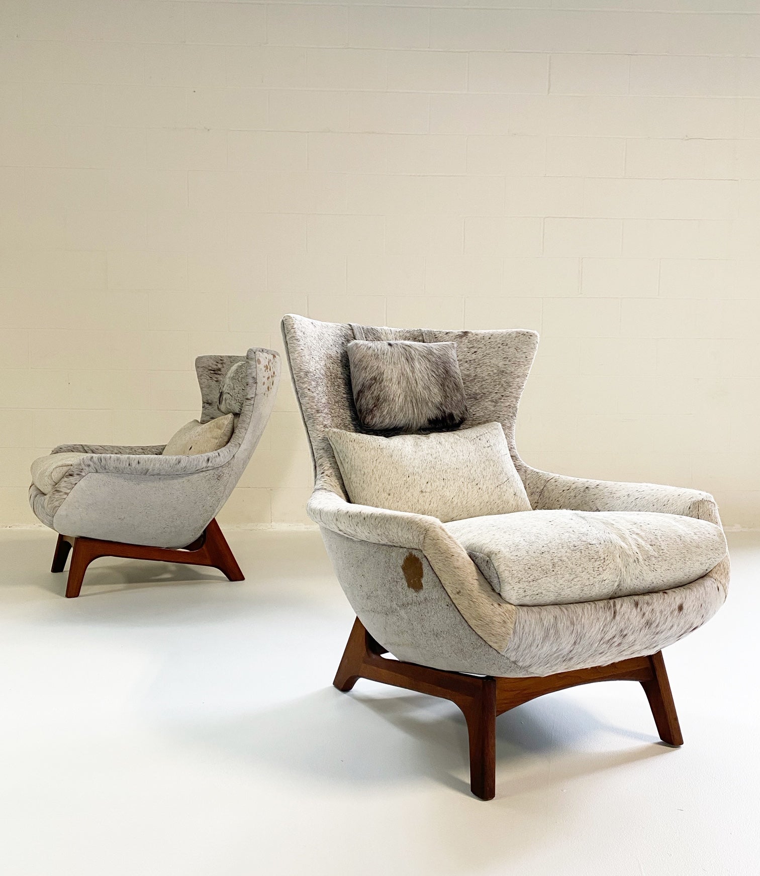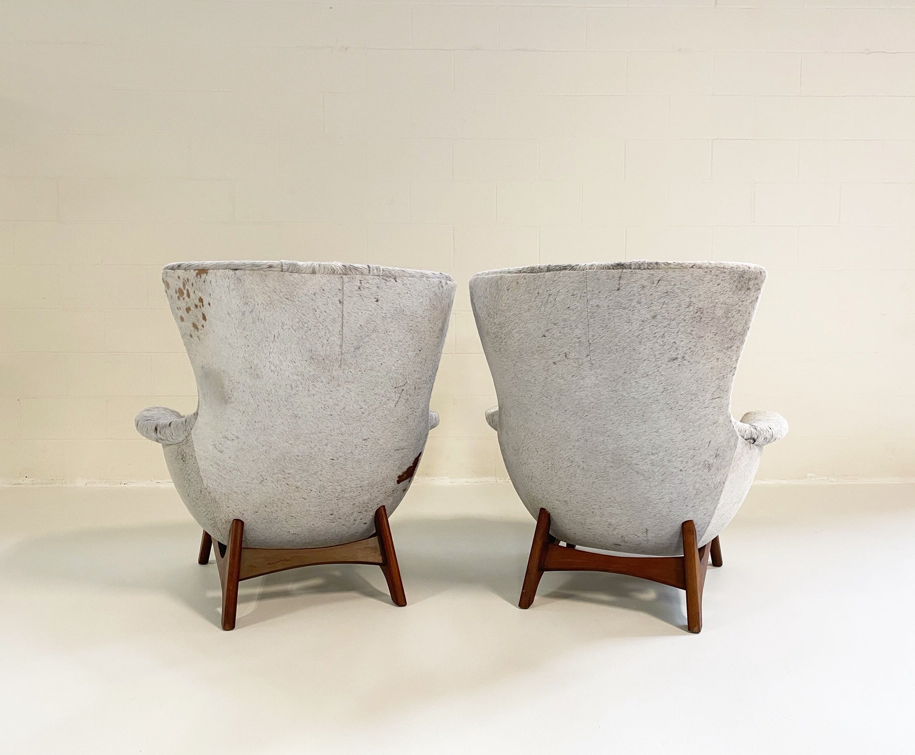 Another prime example of Pearsall's vivacious, swinging 60s iconic designs. And we knew exactly what they needed - our luxuriously soft, silky Brazilian cowhide in a cool tri-color speckled hue. These chairs have been totally restored by our master upholsterers with brand new foam throughout and luxury 100% down-filled cushions. Solid walnut legs.