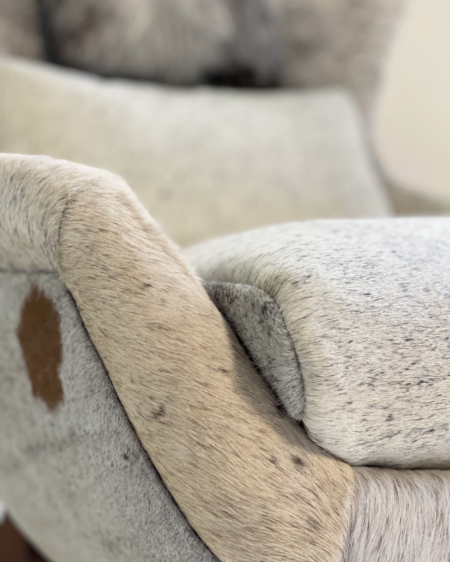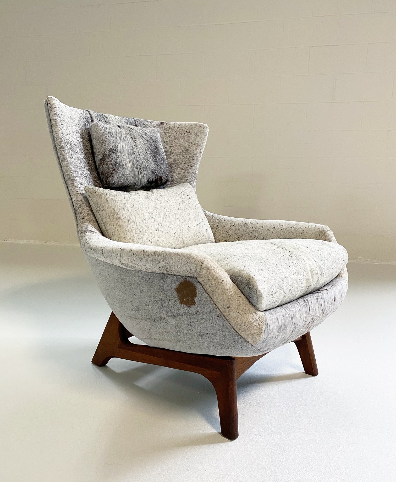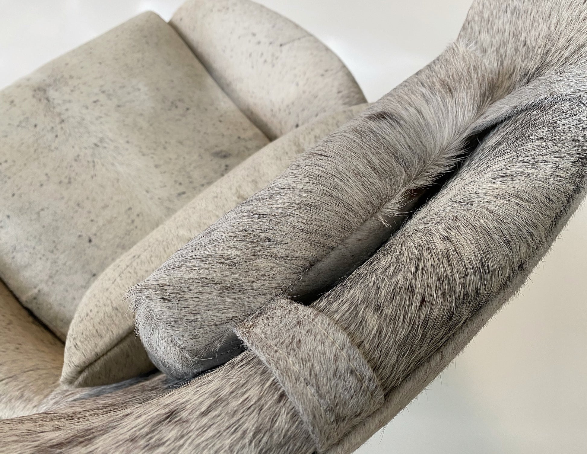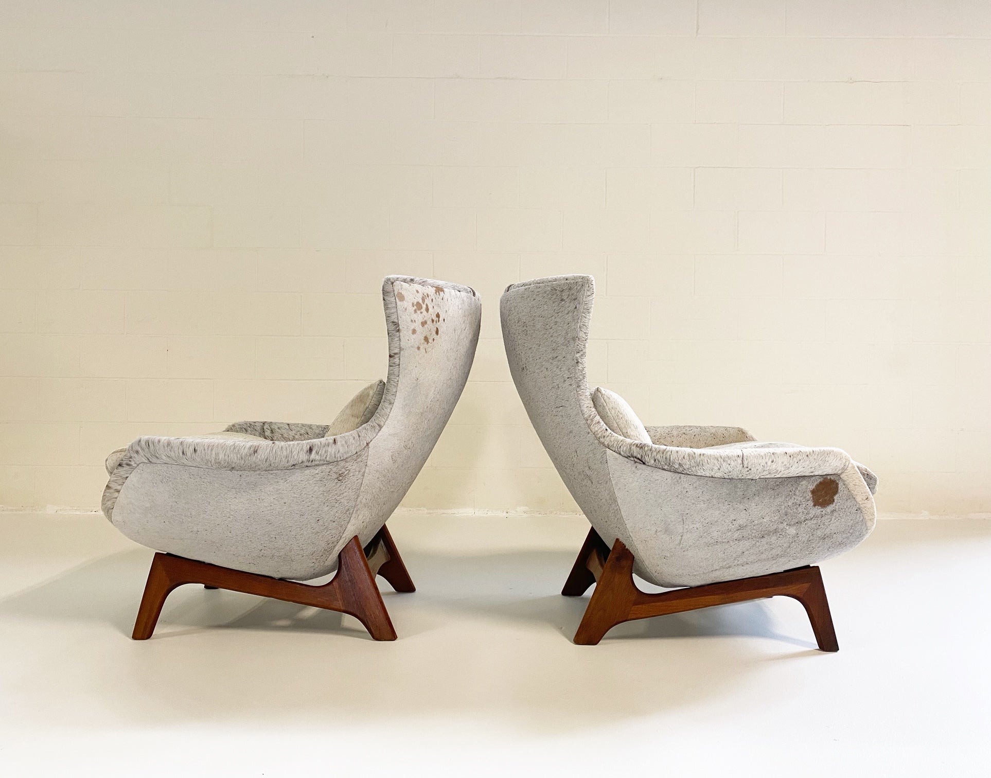 Another prime example of Pearsall's vivacious, swinging 60s iconic designs. And we knew exactly what they needed - our luxuriously soft, silky Brazilian cowhide in a cool tri-color speckled hue. These chairs have been totally restored by our master upholsterers with brand new foam throughout and luxury 100% down-filled cushions. Solid walnut legs.