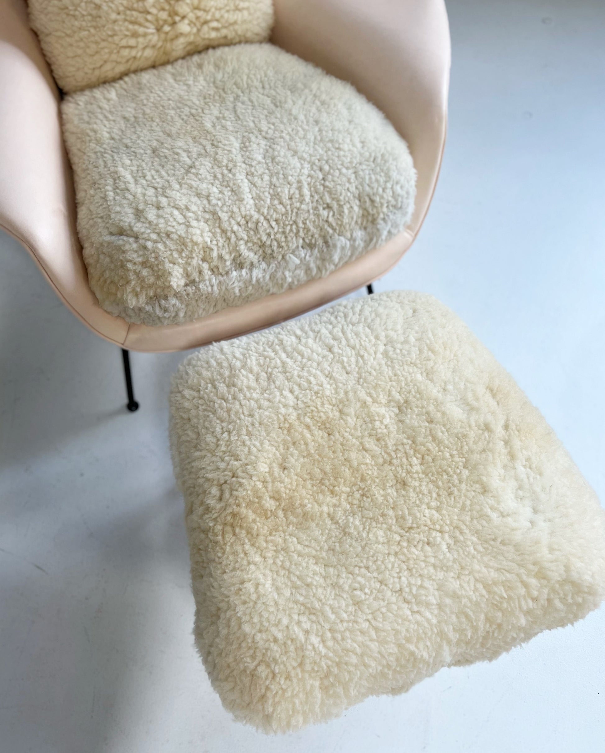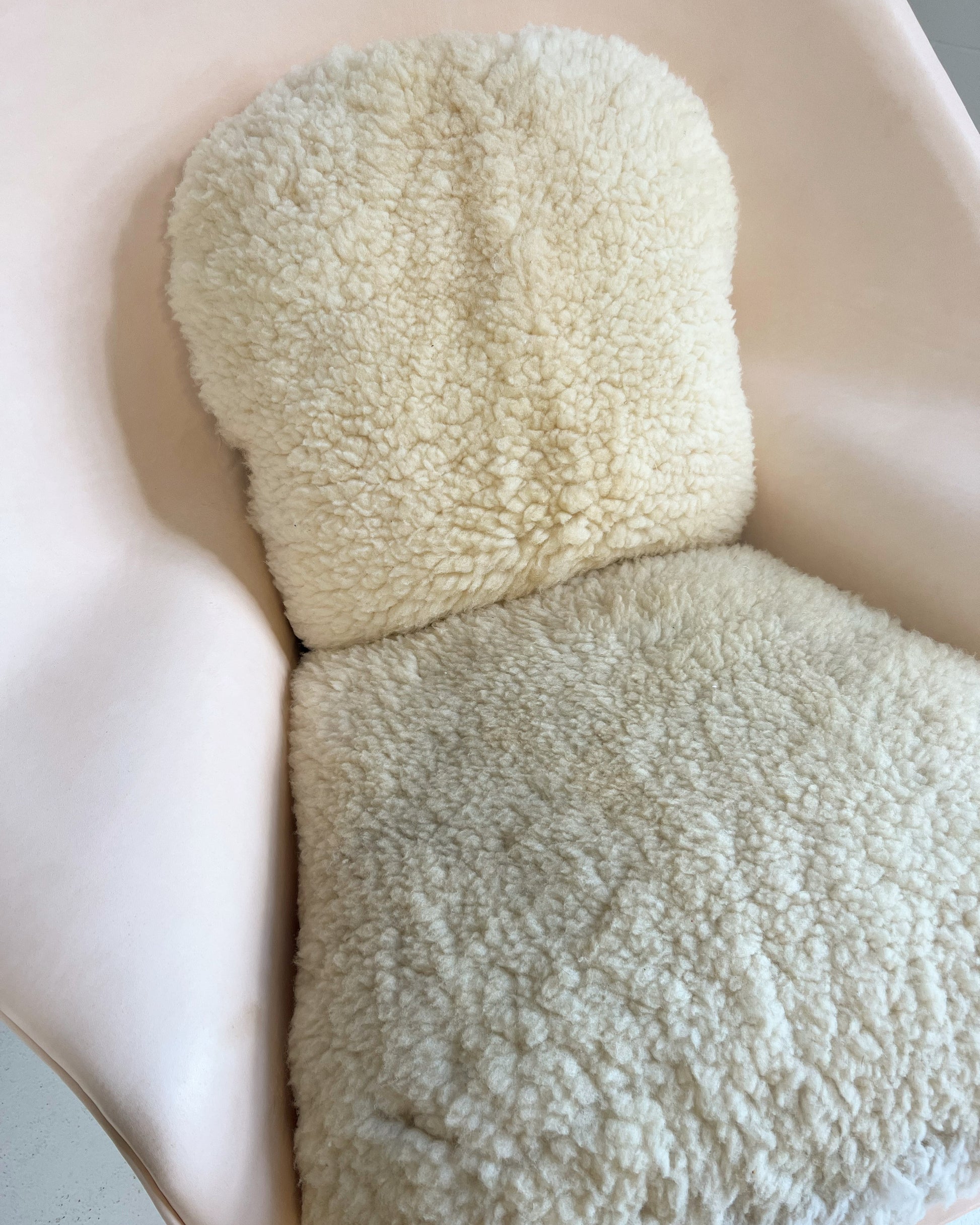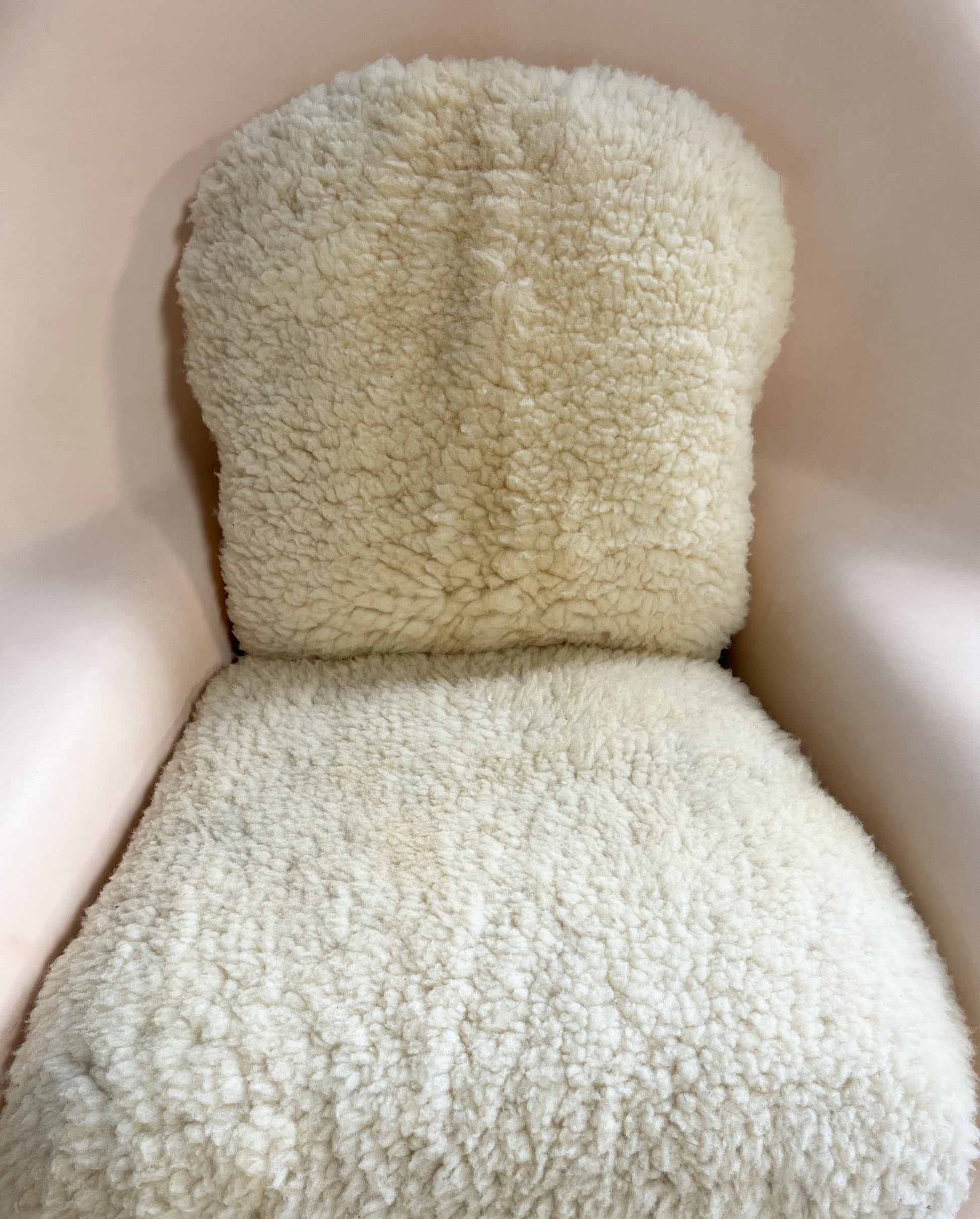 For the restoration and upholstery of this set, we used a beautiful vegetable-tanned leather of the highest quality. We adore this vegetable tanned leather as it will patina over time. We love the contrast of the smooth leather and sheepskin cushions. Each cushion is feather filled for a sink-into, cozy seat.