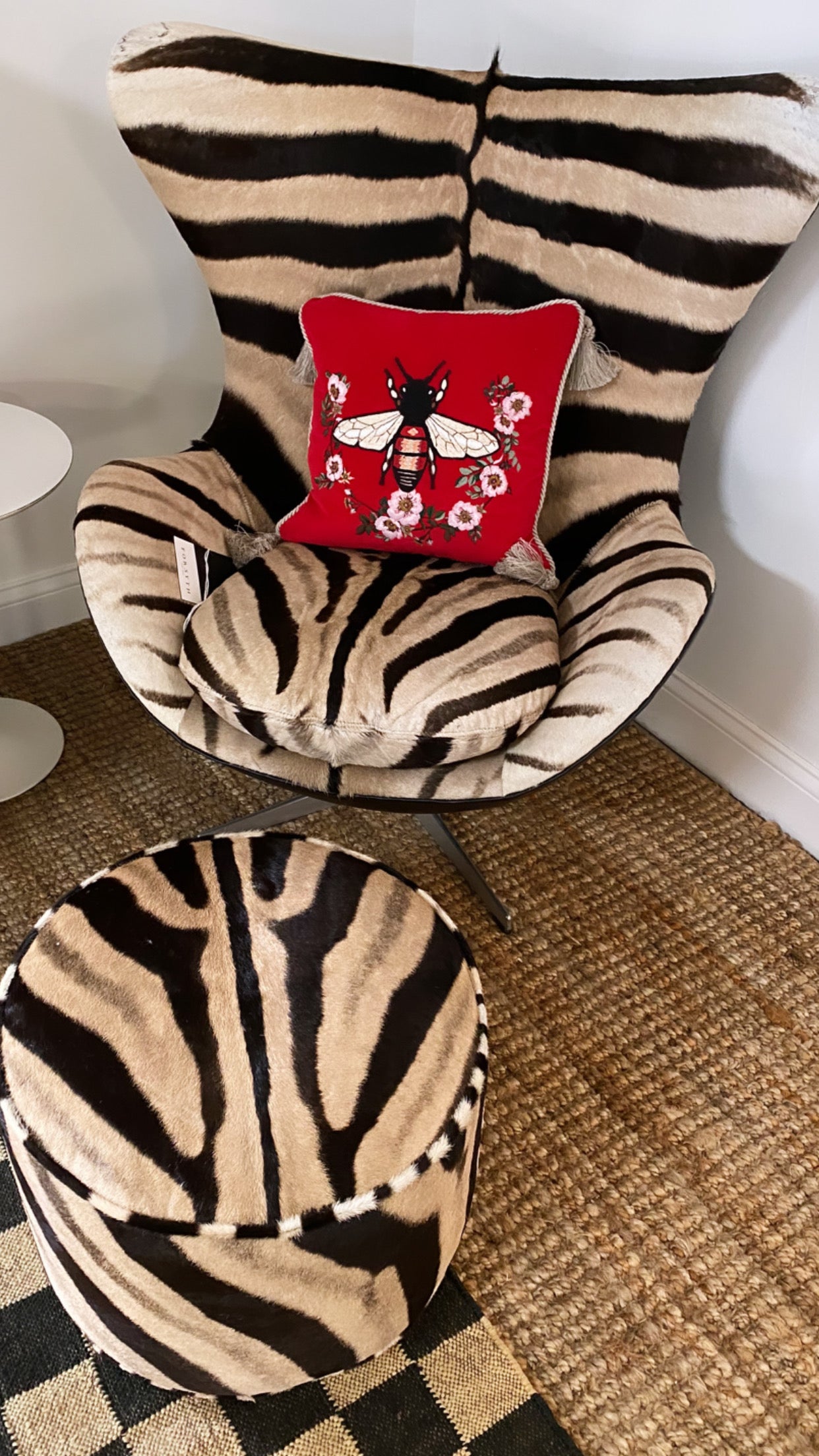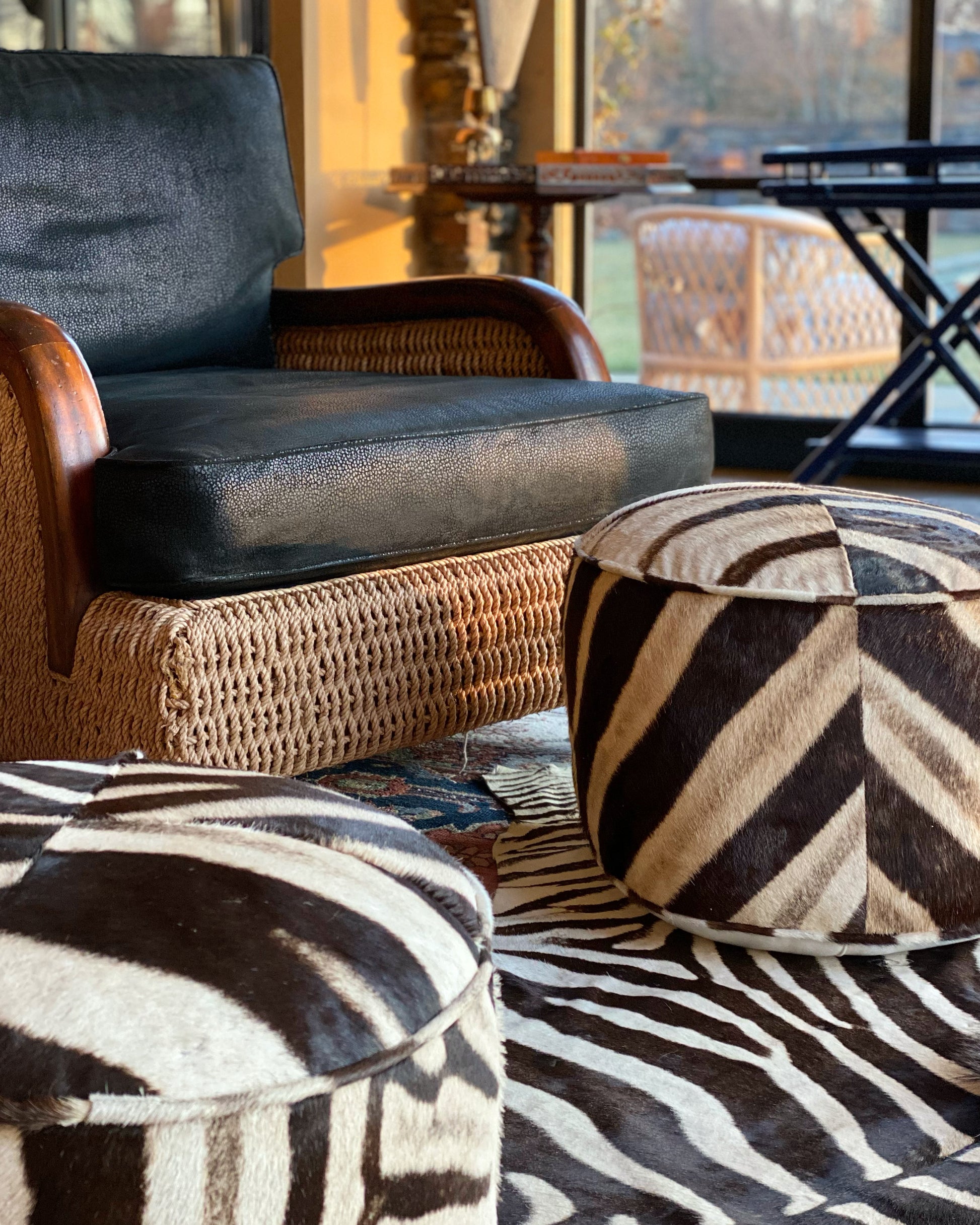 Part of the Forsyth Originals Collection. Our luxurious zebra pouf ottomans are handcrafted from our beautiful Forsyth zebra hides. The most beautiful zebra hides are selected, hand cut, hand stitched, and hand stuffed. Luxurious down feathers fill each pouf, 12 pounds to be exact, and each is finished with a cotton canvas bottom. Each step is meticulously curated by Saint Louis based Forsyth artisans. Every pouf ottoman is a one of a kind masterpiece - no two are the same.